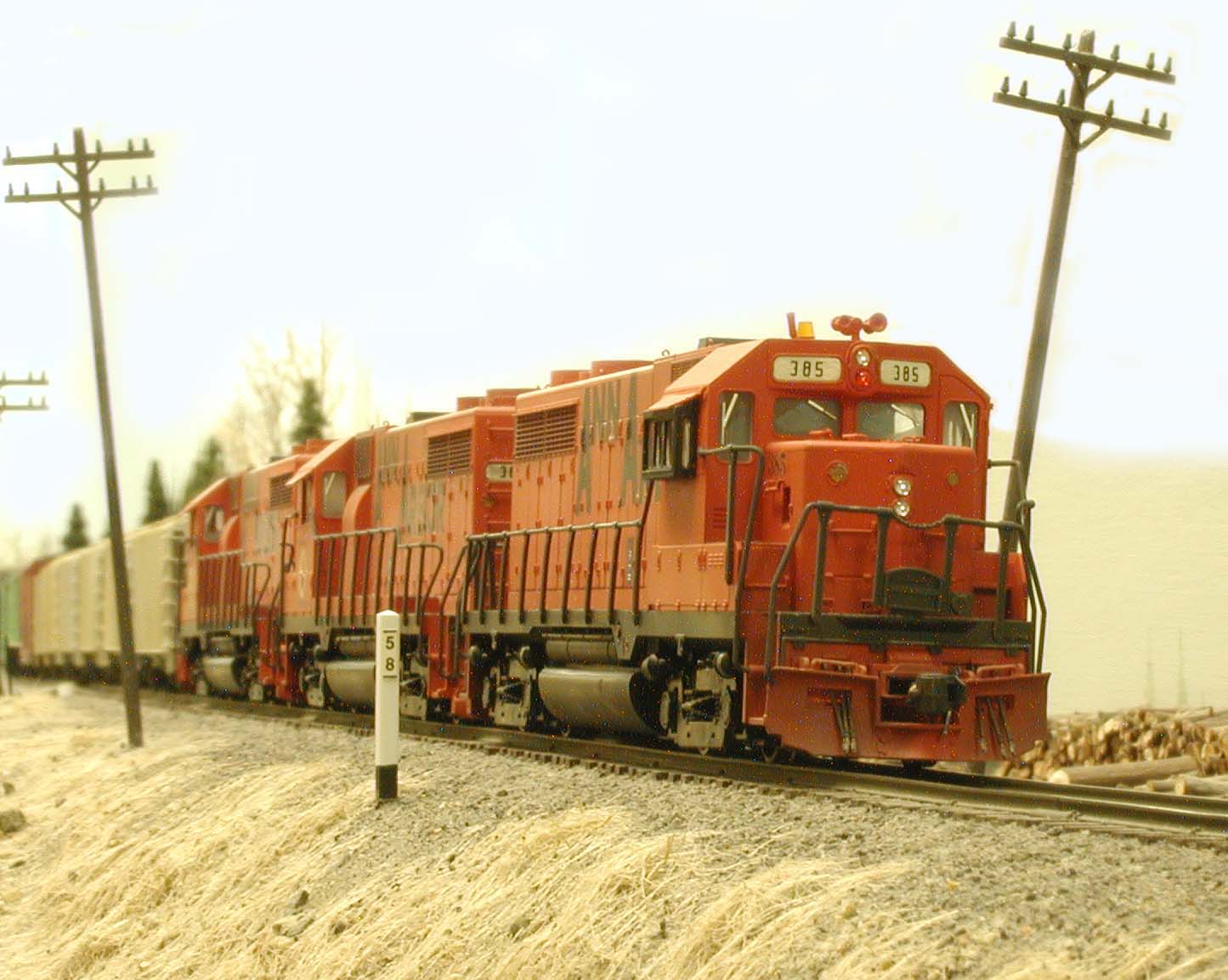 AA 385, 387, and 389, all Kato GP-35's riding on replacement Stewart U25-B sideframe and lettered with the AARRT&HA's decal set. |