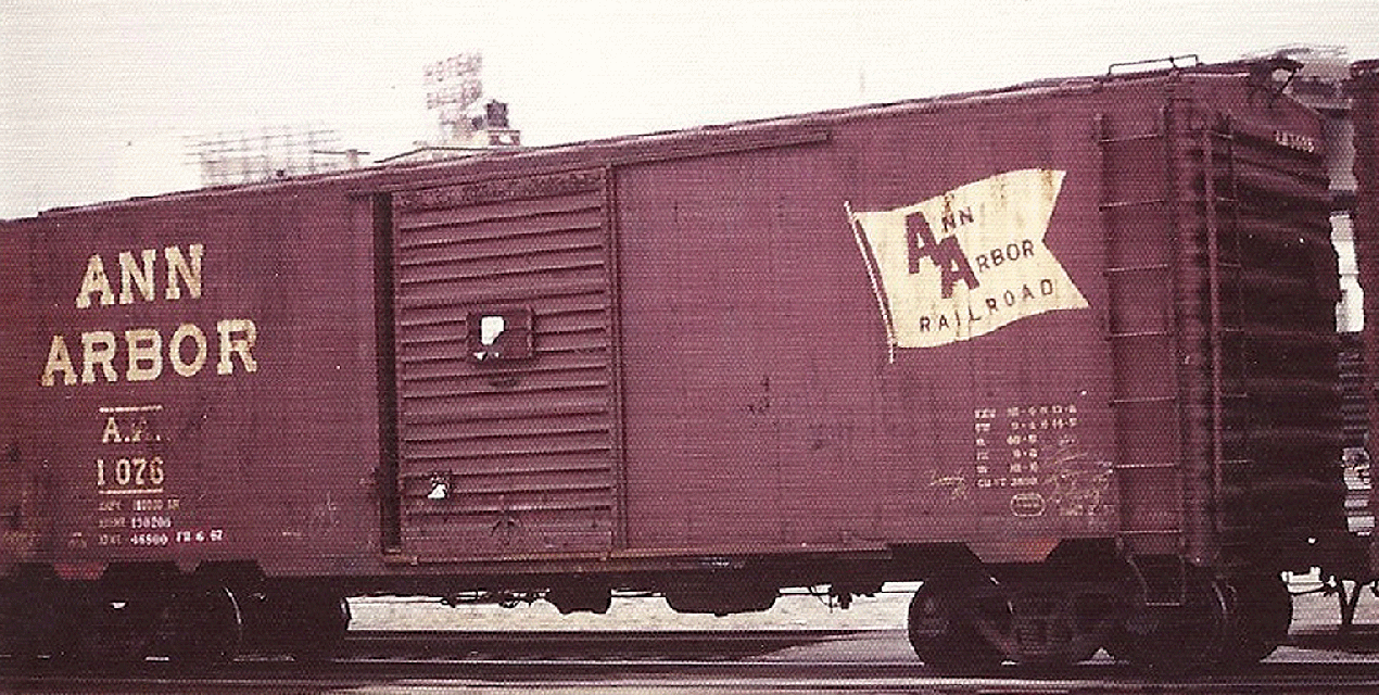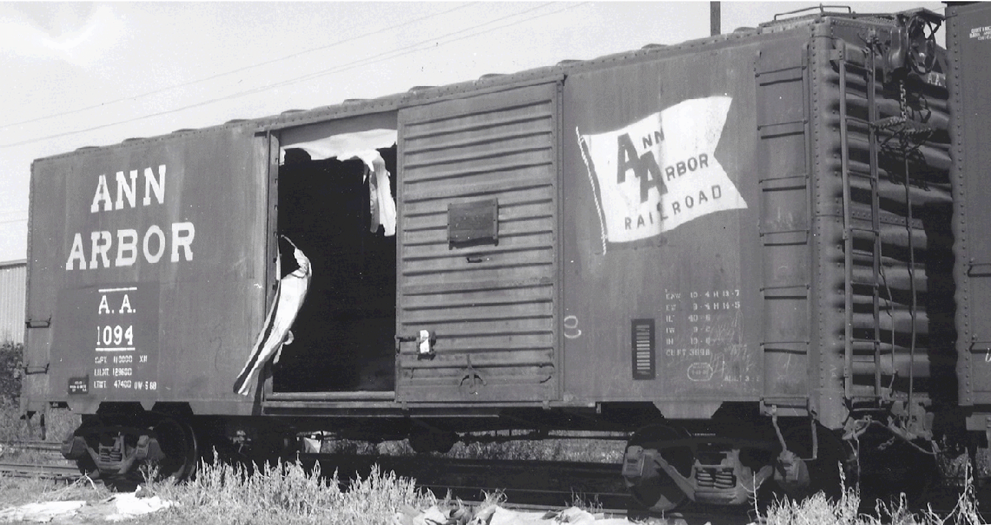 Repainted cars with large pennant heralds all appear to be 55-ton cars. AA 1076 was reweighted in 1967. AA 1094 has a reweight date of 5-68. It had its reporting marks and capacity data restencilled and there is no space between the car numbers digits. |