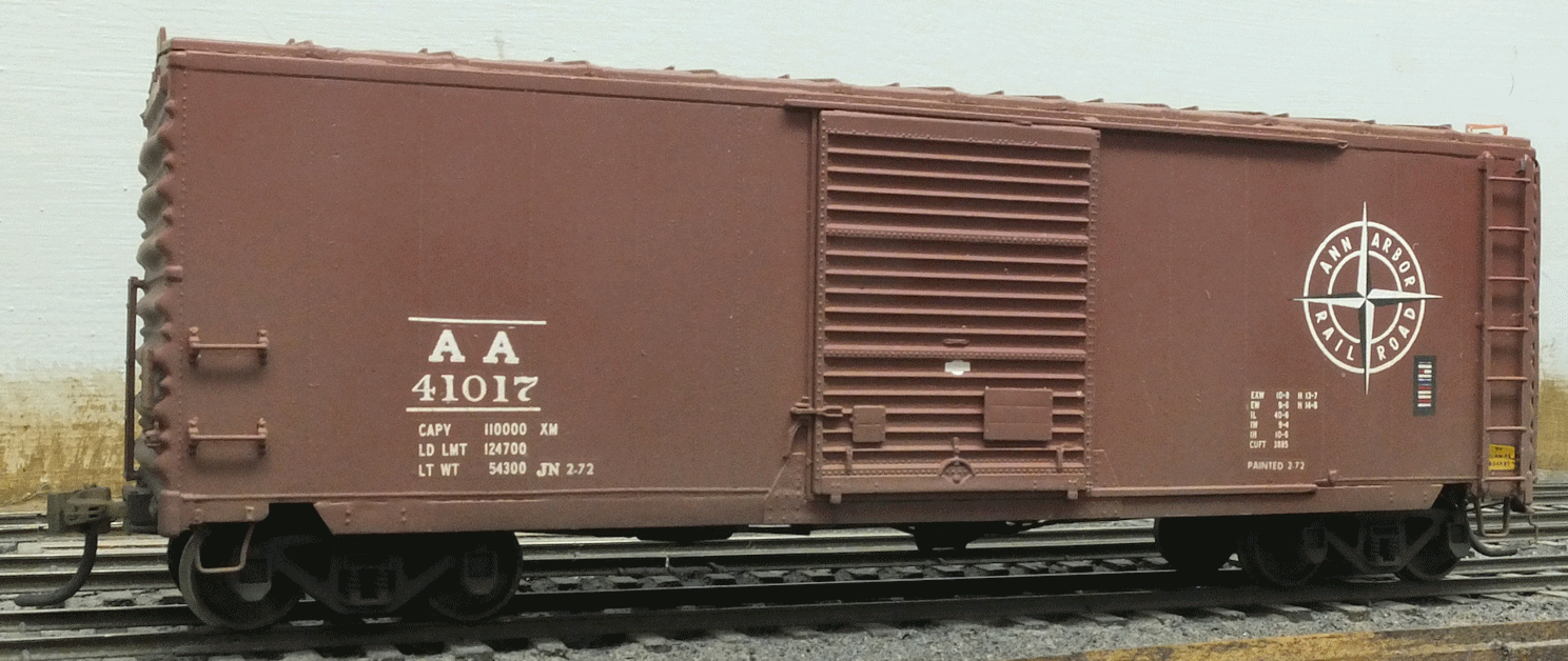 The rebuilt car still has 55-ton capacity. The reporting marks still have line above and below (unusual for a 1972 paint scheme) but no periods behind the "A"s. The car bears an ACI plate as well as a "Keep Off Roof" warning behind the ladder. |