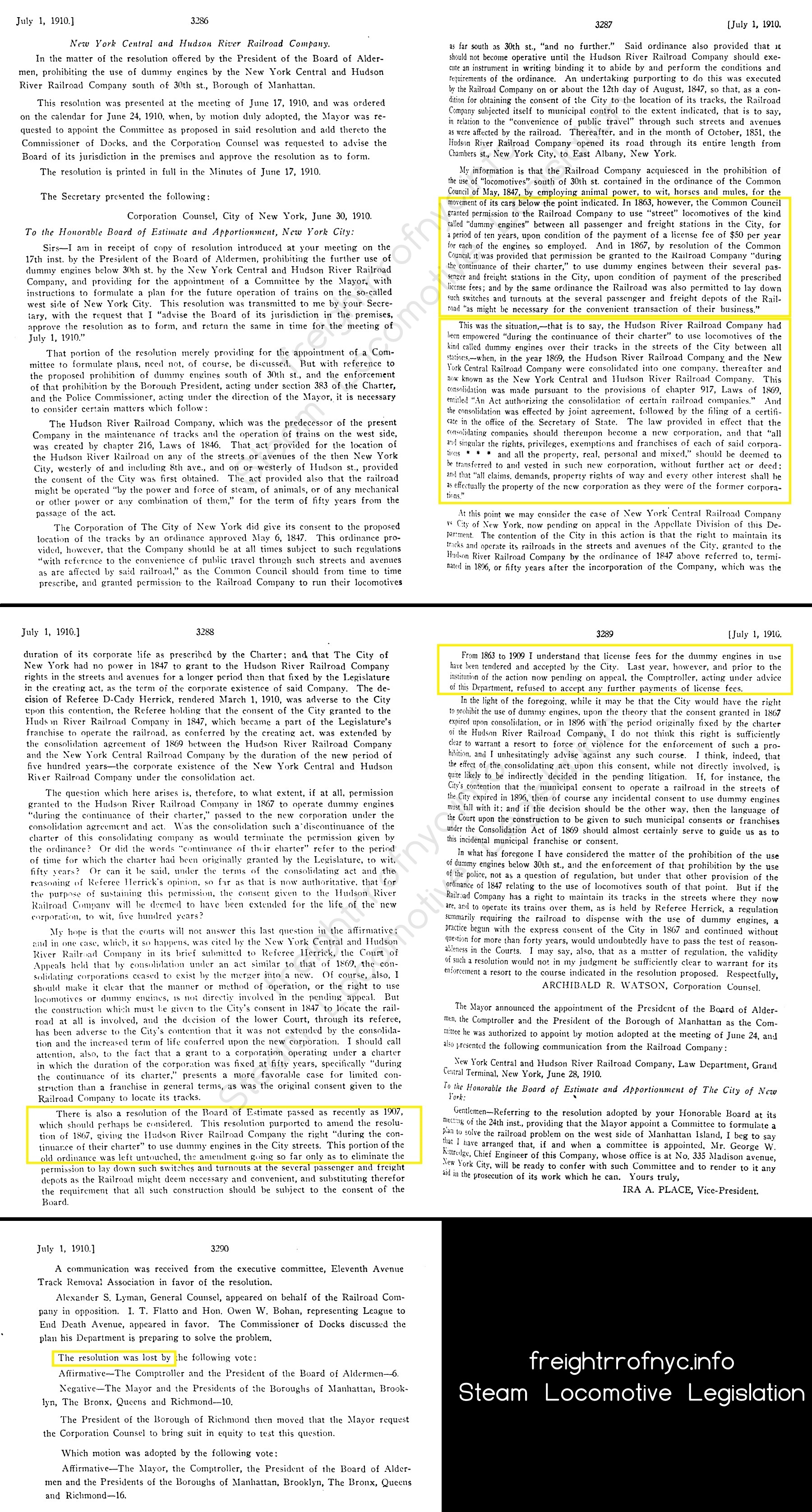 | Another attempt to "evict" the freight operations of the New York Central & Hudson River Railroad. Failed. Even the Corporation Counsel Archibald Watson stated, the railroad was within its rights to operate, as the City had granted them permission to do so. The Mayor and all 5 Borough Presidents agreed. |