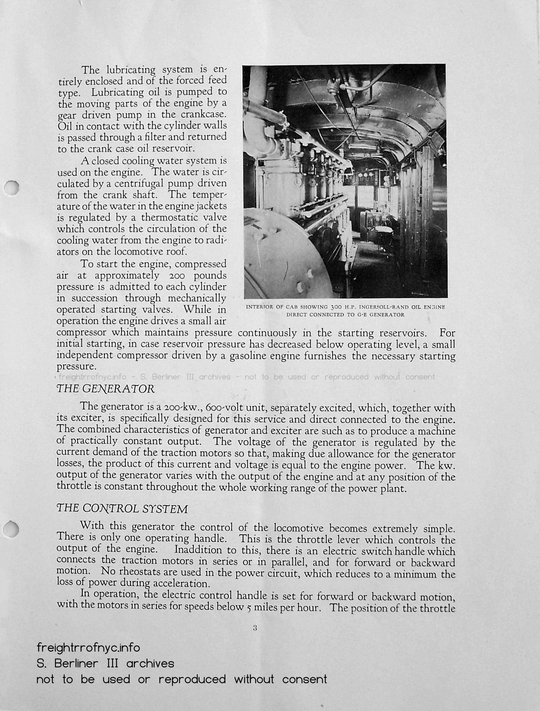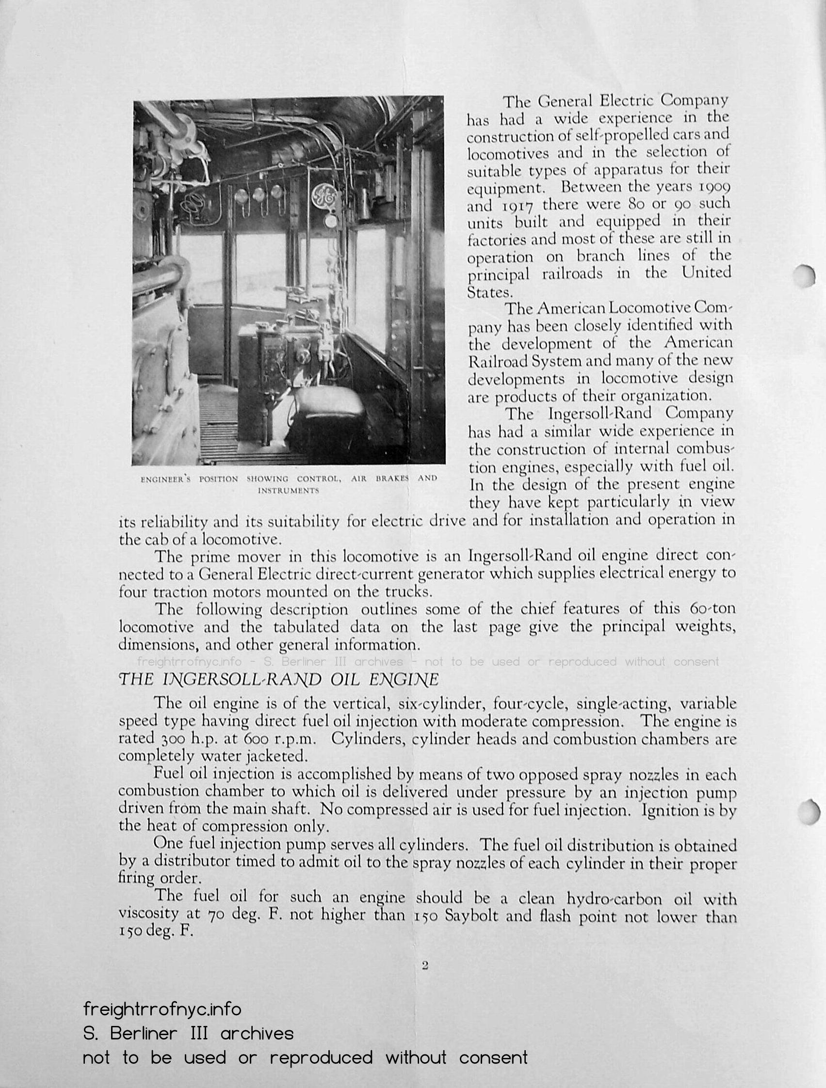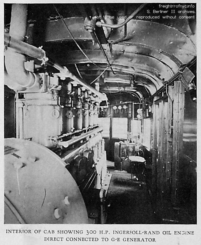 . The first SUCCESSFUL Diesel-electric locomotive in the United States Returning to the specificities of the New York Terminal area, it was the (then) looming compliance date of January 1, 1926 of the Kaufman Act, which really spurred on advances and perfection with the form of diesel-electric propulsion for locomotive power. As a result, Ingersoll-Rand, constructed the following prototype, the GE-IR model X3-1, but it is better known by its construction number: #8835. The locomotive was fitted with an Ingersoll inline six cylinder (10" bore x 12" stroke) diesel engine designed that utilized a block and mechanical design perfected by John Rathbun (a longstanding expert in gas, oil - distillate (similar to kerosene) and heavy oil engines, with solid fuel stream fuel injectors of the Price design (instead of air-blast). Hence the engine being known as a P-R, for Price & Rathbun. This engine developed 300 hp at 550 rpm. This engine in turn, powered a General Electric TDC6-200 electrical generator. The generator in turn furnished electricity to four HM840 traction motors, also manufactured by General Electric; with voltage and current being regulated using controls designed a few years prior by Dr. Hermann Lemp, formerly of General Electric and now working for Ingersoll Rand. The carbody was a left over, laying around at General Electric's Erie, PA facility. This carbody was unique in that one end, the front, was a rounded or bullet nose as was the roof; but the rear end was squared. Nevertheless, both ends contained a control stand for bi-directional operation.All told, this locomotive tipped the scales at 120,000 pounds or 60 tons. The first start up of this locomotive occurred on December 17, 1923. It was not exhibited for public demonstration until February 28, 1924, at the Phillipsburg, NJ plant of Ingersoll-Rand. Initial starting of the Ingersoll engine, if the on-board air supply was depleted, was accomplished with a Mianus gasoline powered air compressor. However, with the Ingersoll engine running, it drove a primary air compressor to maintain the 200 psi necessary for on-board storage and starting, if necessary. The other important factor about this locomotive, was that it utilized engine and electrical components that were already in production, i.e.: were readily available from parts sources. The engine, had already been in production for several years by Ingersoll Rand; and the engine unit required few and minor modifications to adapt it to locomotive use. The fuel injector mechanism was also produced by I-R; so parts were readily available and easily repaired if need be. The generator and traction motors were available on dozens if not hundreds of previous models of General Electric all-electric or gasoline-electric locomotives or motor cars. Unlike all locomotive designs prior to it; the Ingersoll-Rand design, with its B-B wheel arrangement, a rigid truck wheelbase of only 7' 2" and a 35 foot overall length; was a much more logical choice for the tight curve radius (in some cases 90' foot radius or less) as well as the repeated stop and go and idling as typical of the yard and switching operations of the various offline terminals located in and around New York City.