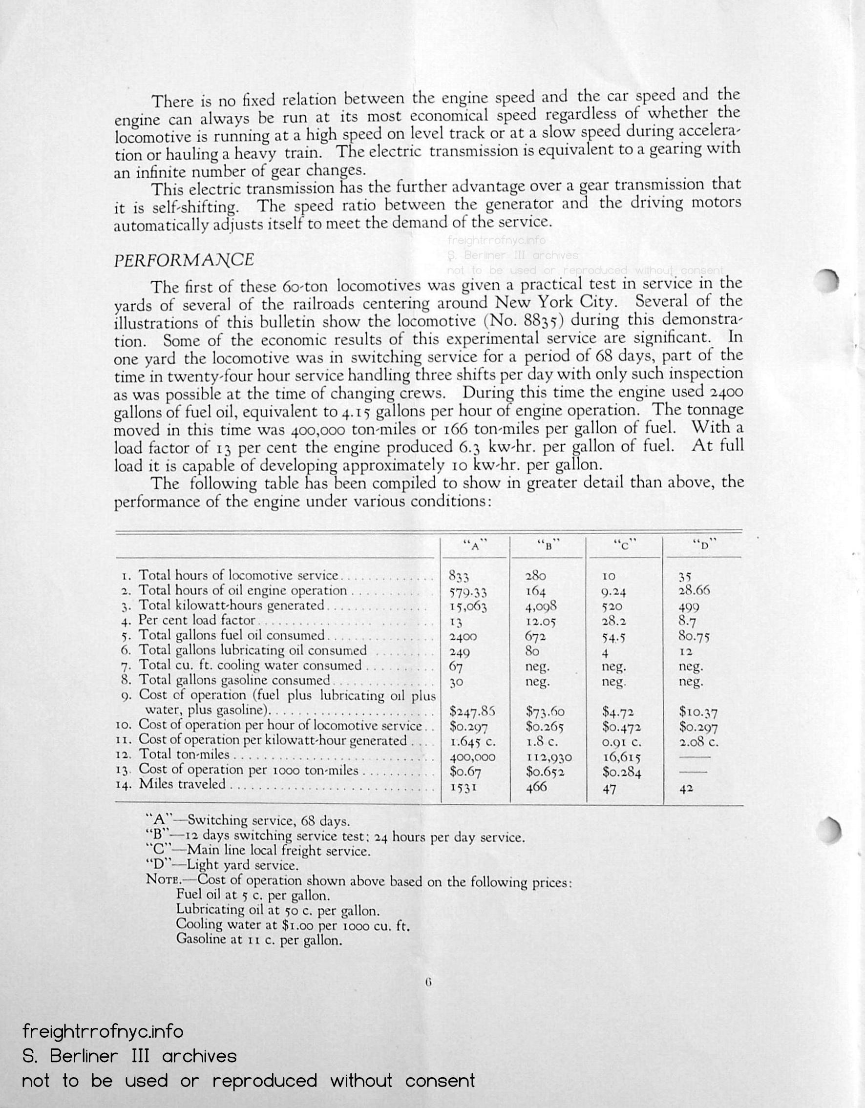 The first is a very logical but mundane fact: the same reason diesel locomotives replaced steam locomotives in the City of New York, is why railroads gave up steam locomotives in other parts of the United States as well. The railroads realized that the diesel-electric locomotive was more economical to operate. This may be a difficult thing for the "rabid railfan" to digest, as well as we are now living in a society where we are pretty much find someone else to blame; but the phase out of steam locomotives was not because it was "banned" by the Victor Kaufmann, or the Kaufman Act, but the steam locomotive was in fact an expensive and time consuming piece of equipment to maintain. . Cost of Operation: The Central Railroad of New Jersey conducted a cost analysis between #1000 (A/GE/IR 300 hp 60 ton diesel-electric boxcab locomotive) and #840 (the 0-4-0T steam locomotive) The first 100 days of operation of #1000, cost the Central Railroad of New Jersey $301.By comparison, the last 100 days of use of #840, in the same function at the same facility in the Bronx, operation of this locomotive cost the Central Railroad of New Jersey $1420. For the record, #840 was in good shape, and would go on to yard switching duties at Jersey City. It was still in operation in February 1952, but would be scrapped in 1954. So, when replaced,in the Bronx, it was stil a viable piece of equipment, not some "hunk o' junk" on its last legs. Diesel-electric locomotives saved the CRRNJ over $1,100 in 100 days. And this was a single locomotive, at a single facility. When you extrapolate that to an operation on the scale of the New York Central's West Side Operation, with no less than a minimum of five locomotives operating simultaneously (and frequently more in the area of a dozen locomotives operating), the cost savings realized is enormous. This is exemplified by the table in the General Electric catalog. Daily and Long Term Maintenance & Repair The diesel locomotive did not need to be kept under steam if not being used, as a steam locomotive did. If it was done being used, a diesel locomotive could be "shut off." Steam locomotives on the other hand, needed a hostler to maintain the fire during off hours of operation; and if not being used, the steam pressure was allowed to drop for the duration. This took time to get the locomotive back up to operational pressure again. After operation, a steam locomotive needed to have the ashes needed to be dumped out of the ash pan. This required going back to the engine house or ash pit, as you couldn't just dump your ashes in the middle of the street. This required time. Time cost money. Diesel locomotives had no such burden. Furthermore, steam locomotive boilers had to be inspected every 30 days. This required "dropping the fire" (allowing a steam locomotive to go cold). This was not beneficial to their longevity. Excessive heating and contracting of the firebox and boiler between cold and hot cycles fatigued the metal, therefore keeping a steam locomotive "hot" increased reliability and reduced down time. While small locomotives gained steam pressure quicker than larger counterparts, it still took time. But even these 30 day inspections still impacted on the work cycle of a steam locomotive. If a defect or breakage was discovered, the locomotive would have to be sent where the men that specialized in various fields, i.e; boiler