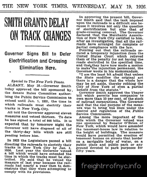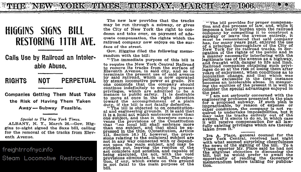 "The immediate purpose of this bill is to require the New York Central Railroad to remove its tracks from the surface of Eleventh Avenue, in said city, and so to terminate the present use of said avenue by said railroad, which is now operated by steam locomotive power at grade."The major issues with the bill, was despite the fact that the City of New York and the New York Central Railroad reached a tentative agreement, the State of New York legislature could not pass it. Therefore, the City simply did not have the financial capital to make restitution to the railroad for condemned property and make this a reality.