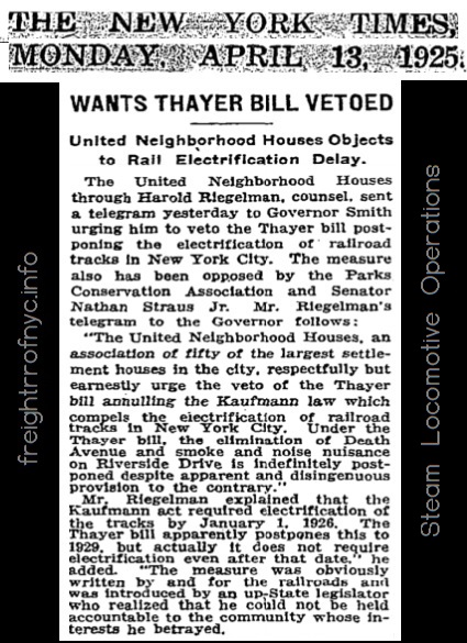 Subsequent newspaper articles reflect that the initial reasons the Kaufman Act was filed was because of nuisance complaints by Upper West Siders. Therefore, the act had nothing to do with pollution. And when I encountered the following testimony; it was like an epiphany. I personally cannot help but think Harkness literally let Kaufman's cat out of the bag in his March 1925 testimony: "The Kaufman act was aimed primarily at the New York Central west side freight line problem," said Mr. Harkness. "Although general in its terms, it did not take into consideration the varying conditions of railroads in the city, and therefore was too rigid. On this account I have been in favor of amending the Kaufman act, and some weeks ago I referred the matter to the Commission's counsel, General Statesbury, to draft a proper measure." Again, Kaufman's and Straus' electoral districts and constituents were West Siders. The fight to get the New York Central Railroad to relocate or remove their street operations had been in discussion since 1909. No doubt the residents of the West Side had lost their patience. On April 13, 1925, the "United Neighborhood Houses" sent a telegram to Governor Smith, through their legal counsel; also opposing the Thayer bills' proposal of a delay. Looking this article over closely; we read "under the Thayer bill, the elimination of Death Avenue and smoke and noise nuisance on Riverside Drive..." Riverside Drive was north of the street running freight operations along "Death Avenue" (the sensationalist moniker given to street operations on Tenth and Eleventh Avenues, south of West 60th Street.) Riverside Drive commences at West 72nd Street and proceeded north until West 181st Street in Washington Heights, a distance of 5.4 miles. Its location is somewhat aways from the hotbed of street running freight trains tying up pedestrian and vehicular traffic in Midtown. While there were in fact several railroad crossings at various streets perpendicular to Riverside Drive, there was no switching or yard activity along this section of line; therefore transiting this area were "through trains", and henceforth this section of line was not subject to excessive waits and gridlock like experienced in Midtown; much like the railroad crossings that existed along the line in Westchester County. The crossing and streets remained open; until a train approached, then opened again after it passed within a minute or two. Track speed was 30 miles an hour or better. Trains did not sit blocking the streets while switching and reversing back an forth in Midtown. Furthermore, the railroad right of way in the Riverside Drive area was clearly defined and separate from roads and streets and sidewalks. So, why were a bunch Upper West Siders getting on the band wagon? So, it now clearly appears that NIMBYism was at the core amongst the affluent Upper West Siders and the Kaufman Act. Riverside Drive was then, and is still known for the affluent high rent apartments and condominiums built there. They did not incur an inconvenience from a train blocking a street like it did in Chelsea (Midtown Manhattan). It wasn't about reducing pollution. It was about appeasing wealthy and vociferous residents. Once again, people build or buy next to an industry, a railroad, an airport, a seaport, an interstate highway; and after moving in only to find it a nuisance, and they want it shut down or relocated. Say no more. The railroad was routed through the area in 1846-1850. The Riverside area then was wild, undeveloped land. The Midtown residents that were better off financially, and wanting to escape the congestion of Midtown living, now looked to move further north, to where there were views of the majestic Hudson River.. untamed parklands.. then "Wooo, wooooo! Chugga chugga chugga, clickity clack, clickity clack." "What!?! A train goes through here!?!? Oh no, that won't do, no sir. Not at all. Send the train someplace else, anywhere, just not here! I'm going to write my assemblyman." It should be noted, for the record; the City of New York, the State of New York and the New York Central had been negotiating and dickering over the solutions to the West Side issue for decades. As soon as the Central and the City found a solution, the State came in and said it was no good, they wanted control over the matter and wanted something else. More or less, it resulted in a grand state of confusion which it could not be determined which municipal agency had jurisdiction: "In 1911 (chapter 777 of laws of 1911) the West side Improvement was made the subject of special legislation, and the carrying out of the improvement was left generally for direct action between the City authorities and the railroad company. Under the Mitchel Administration plans for carrying out the West Side Improvement were developed in great detail, but at the last the proposed arrangement failed of approval. In 1917, the special legislation of 1911 was amended to confer certain jurisdiction of the (state) Public Service Commission for First District (chapter 719, laws of 1917). The Central would agree to the States' request; and now the City wanted something else, something more. And for quite some time, the New York Central kept agreeing to finance those growing requests. It went back and forth for months, months turned into years, years into decades. It was like trying to hit a moving target. Surprisingly, according to the recorded negotiations, the Central was repeatedly agreeable to the mounting costs. The residents of the West Side elected a man who vowed to get the New York Central to relocate or cease operations altogether. But let us face it, if Kaufmann went on record with his sights set on only the New York Central (as others had done prior to him), he would get no farther than the others before him. So it is my opinion here, that he disguised his attack on the Central's operation as something much more palatable and sympathetic to a wider audience as well a