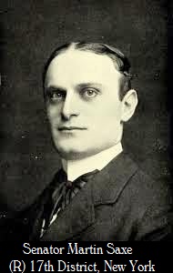 Martin Saxe was born August 28, 1874 in New York City. Martin was the son of Fabian Sachs and Theresa Sachs, née Helburn. He graduated from Princeton University in 1893. Saxe was a member of the New York State Senate (R) from 1905 to 1908, sitting in the 128th, 129th (both 17th District), and the 130th and 131st New York State Legislatures (both 18th District.) In April 1915, he was appointed to a three-year term as Chairman of the State Tax Commission. He died on February 5, 1967, at his home at 101 Central Park West in Manhattan. |