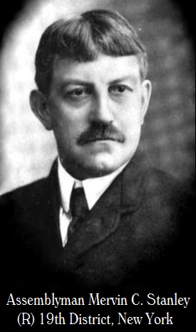 | Mervin Clark Stanley was born May 6, 1857 in New Britain, Hartford County, Connecticut. He was the son of Oliver Cromwell Stanley and Charlotte Stanley, née Hine. He became a lumber, coal and builders' supplies merchant in New Britain. On January 23, 1884, he married Martha Fenn Miles. In 1899, he relocated to New York City, and became a partner in a firm of commission merchants and exporters. Mervin entered politics as a Republican, and became a personal friend of Governor Charles Evans Hughes. Stanley was a member of the New York State Assembly in 1905, 1906 (New York County, 19th District) and 1907 (New York County, 15th District) He died on February 1, 1907, at his home at 329 West 82nd Street in Manhattan, after undergoing two operations for appendicitis; and was interred at the Fairview Cemetery in New Britain, CT |