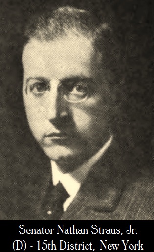 the New York State Senate from 1921 to 1926. He was the son of Nathan Straus, a co-owner of Macy's department store and a prominent philanthropist, and Lina (née Gutherz). He attended Princeton University as well as the Heidelberg University. He worked as a reporter of the New York Globe from 1909 through 1910; and was also editor of Puck Magazine from 1913 through 1917. During World War I, he served as an ensign in the United States Navy. after the war, he became Assistant Editor of the New York Globe, but left in 1920 because of that publications support for Republican presidential candidate Warren G. Harding. Instead, Straus entered politics as a Democrat, and was a member of the New York Senate from 1921 through 1926. During his three terms, he introduced legislation of mandatory automobile insurance, female inclusive juries, and ratification of the Child Labor Amendment. Straus chose not to run for reelection in the Senate in 1926. Straus was married to Helen (née Sachs), daughter of Bernard Sachs, a neurologist for whom Tay–Sachs disease is named and member of the Goldman-Sachs family. They had four sons: Nathan Straus III, Barnard Sachs Straus, Irving Lehman Straus, and R. Peter Straus. On September 13, 1961, Straus was found dead in a motel room in Massapequa, New York. According to his family, he suffered from a heart condition, and it was determined that he died of natural causes. He is buried at the Mount Pleasant Cemetery in Hawthorne, New York. |