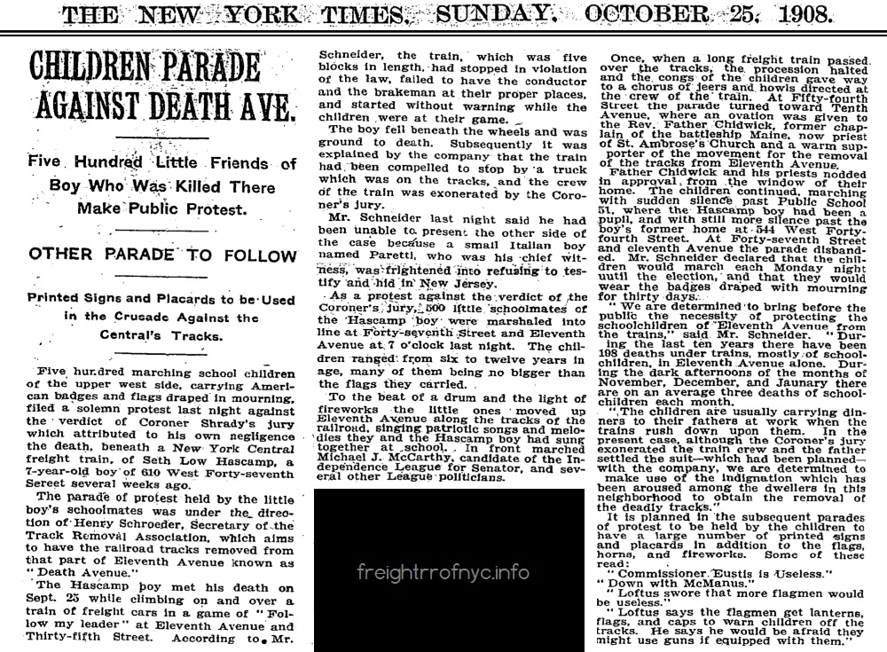 eliminate the trains from the West Side. On Monday, September 25, 1908; seven year old Seth Low Hascamp and a group of friends were playing "follow my leader"; of which their route included climbing upon and over the cars of a freight train that had stopped in the middle of Eleventh Avenue at the intersection of West 35th Street. While upon the freight cars, the cars began moving and Seth was thrown from the car to beneath the wheels and crushed. Although it has been postulated that it was illegal for trains to stop at the location in order to avoid such accidents, and the people were quick to blame the conductor or the brakemen, who were allegedly "not be in their proper places" when the train suddenly started moving again. Let us analyze this for a moment. "Illegal to stop the train." What if the train had been stopped because of a pedestrian or horse and wagon in their way? Are we to presume the train was to keep going and run over the person or horse instead to abide by the regulation? And would this not bring us right back to where we are: an unnecessary death caused by the freight operations in the street? Whether the train was moving, or standing still; it would have still presented a danger; but an avoidable danger. A preventable danger, by not getting close to it. Lo & behold, that was exactly why the train was stopped it was found that the train had been compelled to stop by a truck which was on the tracks! Stop or don't stop, the railroad is damned if does and damned if it doesn't. It's said the "conductor and brakemen were not in their proper places". |