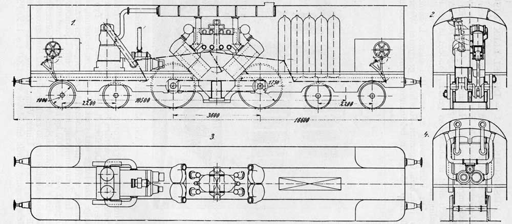 After several test runs between Winterthur and Romanshorn, Switzerland; this diesel–mechanical locomotive was delivered to Berlin in September 1912. It had a 2-B-2 wheel arrangement (4-4-4 under the Whyte steam notation system), and weighed 207,000 pounds. The two cycle, four cylinder engine, had a 15½ " bore by 21½" stroke "Vee" engine (cylinders mounted at 45 degrees) and developed 1,200 horsepower, powered the center four driving wheels through a jackshaft drive system, and reached a sustained speed of 62½ mph. The starting system of this locomotive was somewhat complicated. A smaller diesel engine ran a compressor to get the air pressure reservoirs up to 600 to 1000 psi, and after this was attained; the reservoir air and the compressor air combined was then discharged into the main diesel engine to get the locomotive moving, basically as a compressed air engine. When the locomotive speed reached 6½ mph, the main diesel fired, and the auxiliary diesel shut down. Road testing the locomotive took place in 1913 on the Swiss Federal Railways between Winterthur and Romanshorn; Switzerland revealed testing two significant deficiencies: