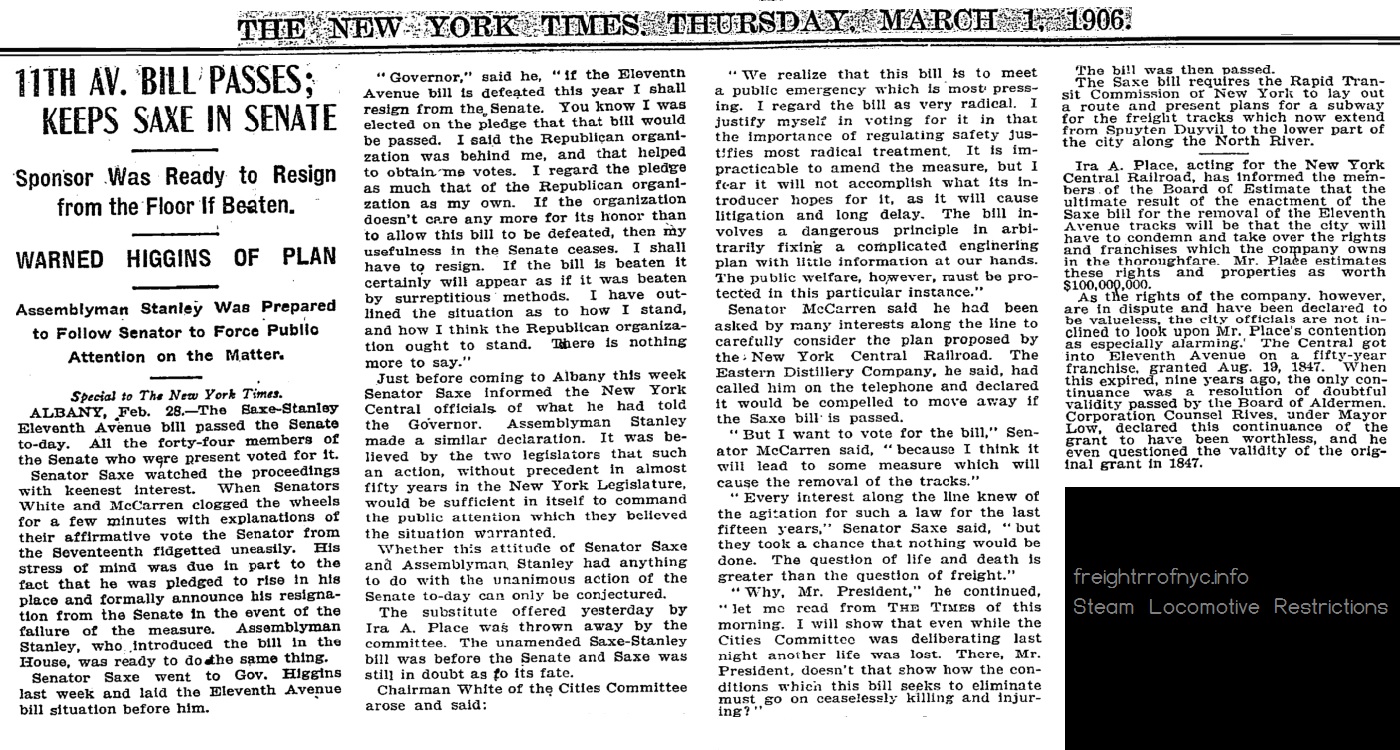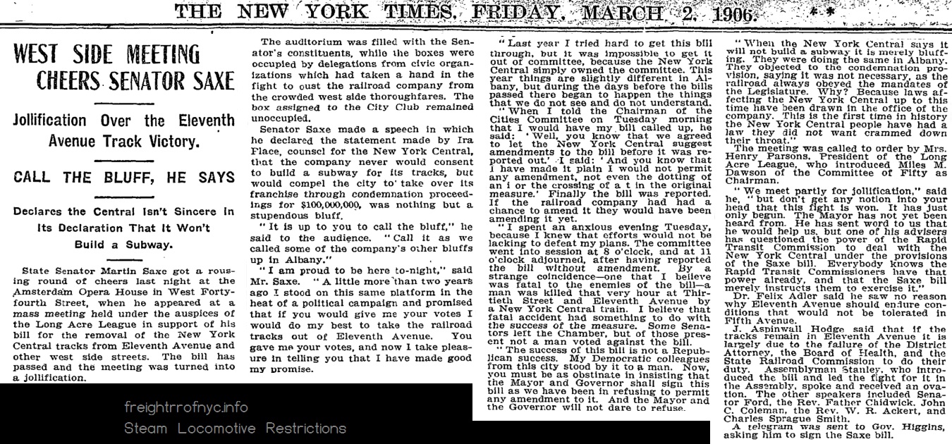 | The Saxe Bill was the first attempt to solve the West Side Problem (street running of freight trains.) Failed. |