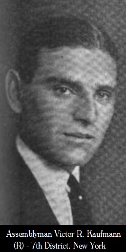 chairman of the Municipal Tax Commission. Victor attended DeWitt Clinton High School, Far Rockaway High School, and Cornell Law School, graduating from the latter in 1918. He also graduated from the Naval Academy in Annapolis, Maryland, after a special three months course. During World War I, he served as an ensign in the United States Naval Reserve. In 1919, Kaufmann was admitted to the bar. In 1921, Kaufmann was elected to the New York State Assembly (R), representing the 7th District of New York County (Manhattan). While in the Assembly, he sponsored the Kaufman Act in April 1923. He served in the Assembly until 1924 and was also chairman of the Assembly's military affairs committee in 1924. Kaufmann served as Deputy Attorney General of the State of New York from 1925 through 1931. He was a member of the New York State Executive Committee in 1928. He began serving as assistant clerk of the Assembly in 1936. he was also secretary of the Republican New York County Committee when Kenneth F. Simpson was chairman. In the 1942 election, he was chairman of the Dewey Volunteers, a nonpartisan organization that worked to elect Thomas E. Dewey as Governor of State of New York. He passed away on February 5, 1943 while under an operation for an abdominal issue. He was survived by his wife Anna, and a daughter Shirley Ann. |