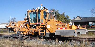 Ballast sweeper at Winona, MN, 10/19/03. Plow (left end) and brushes