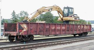 Tie Car at Winona, MN, 7/06/01. The on board back hoe makes it a "self