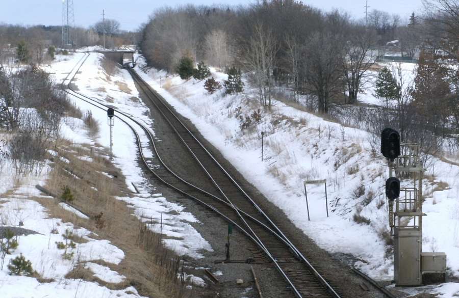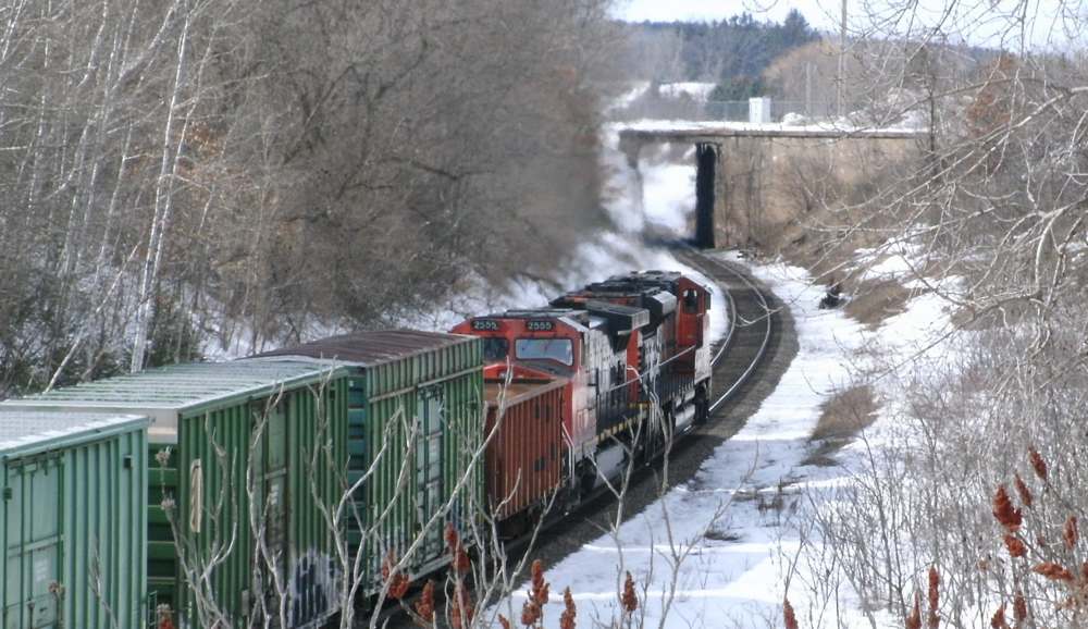 Afternoon on a Sunday, Amherst Junction, Wisconsin. A CN train is heading west toward the underpass. There are very few crossings near here, and I had no long-distance warning of a train horn that this train was coming. Just a gradually increasing roar by the cut. |