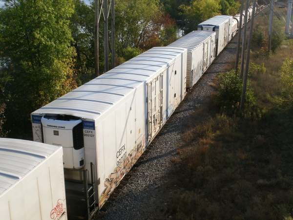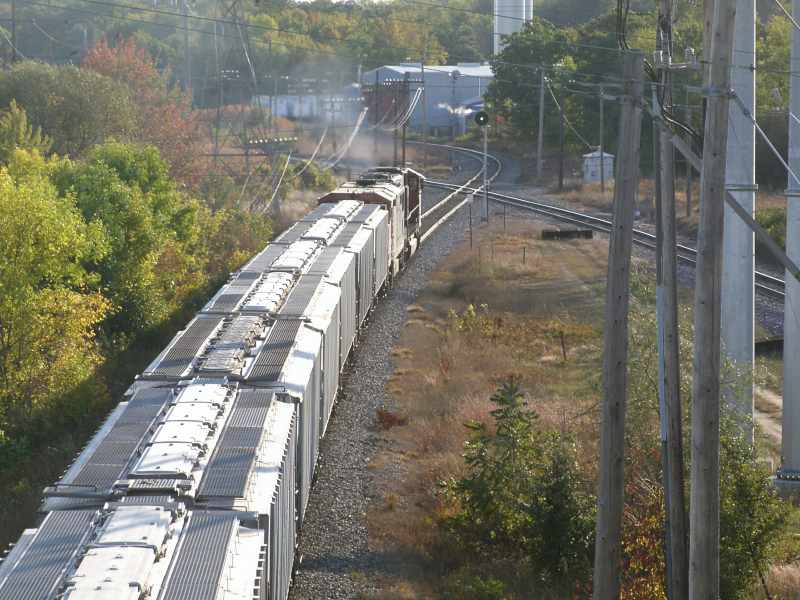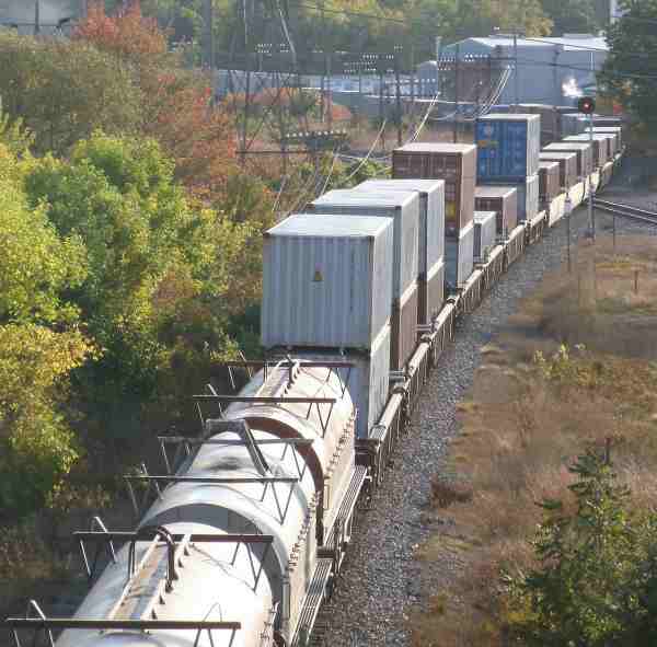 The head end cars are corn for the ethanol plant at Stanley. The rest are a real variety going east. |
