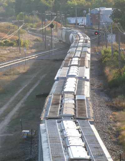 I think this is a short train? The rear end is on the bridge and the head end stopped, waiting for the light to turn. |