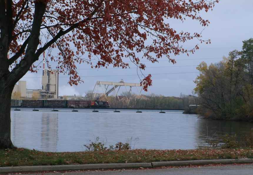 Eastbound to Biron, crossing the Wisconsin River. (all the Autumn leaves have fallen as of Nov 1st) |