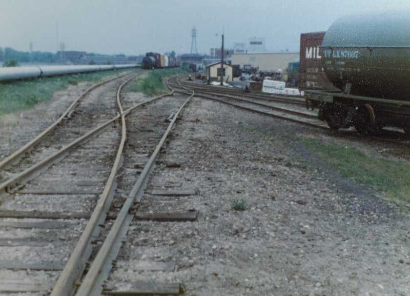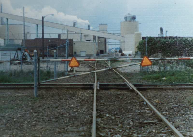 Looking south at the mill lead. The track on the left / east is on the levee of the Wisconsin River. The lower track is where engines and rail cars are half-hidden as seen from the east side of the river. |