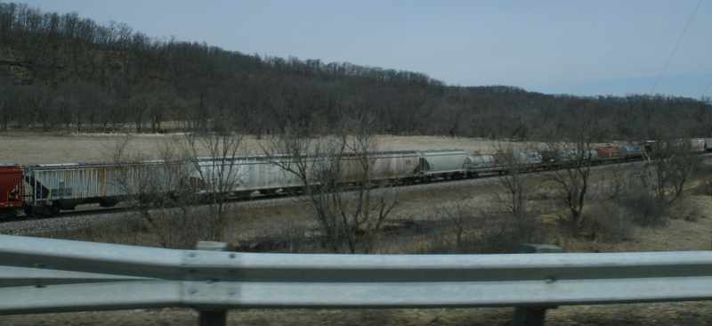 Saw many trains while driving, most beyond the trees. Here's a train crossing under I-94 a few miles east of La Crosse; my wife got this scene. |