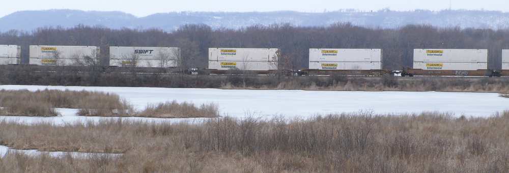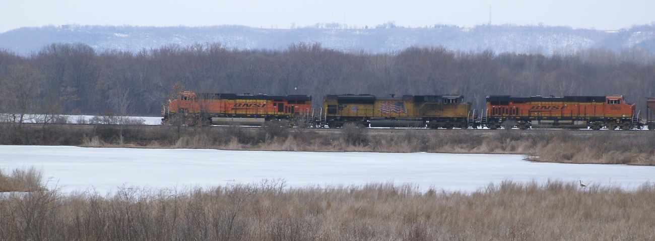 In just ten minutes, I saw all this on the BN north of La Crosse, at Brice Prairie. The weather was nice, 40's, but a bit hazy by this frozen back water of the Black River. |