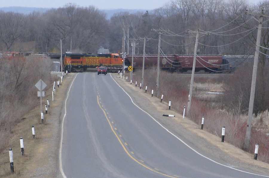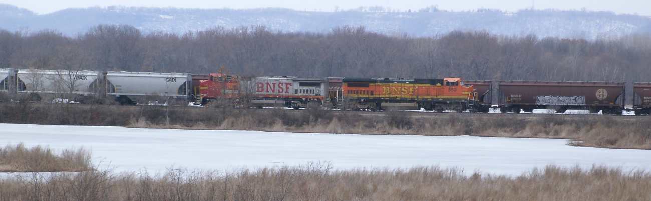 | Southbound with BNSF 3-bay hoppers. There's a speck of a goose on the ice on the lower right. |