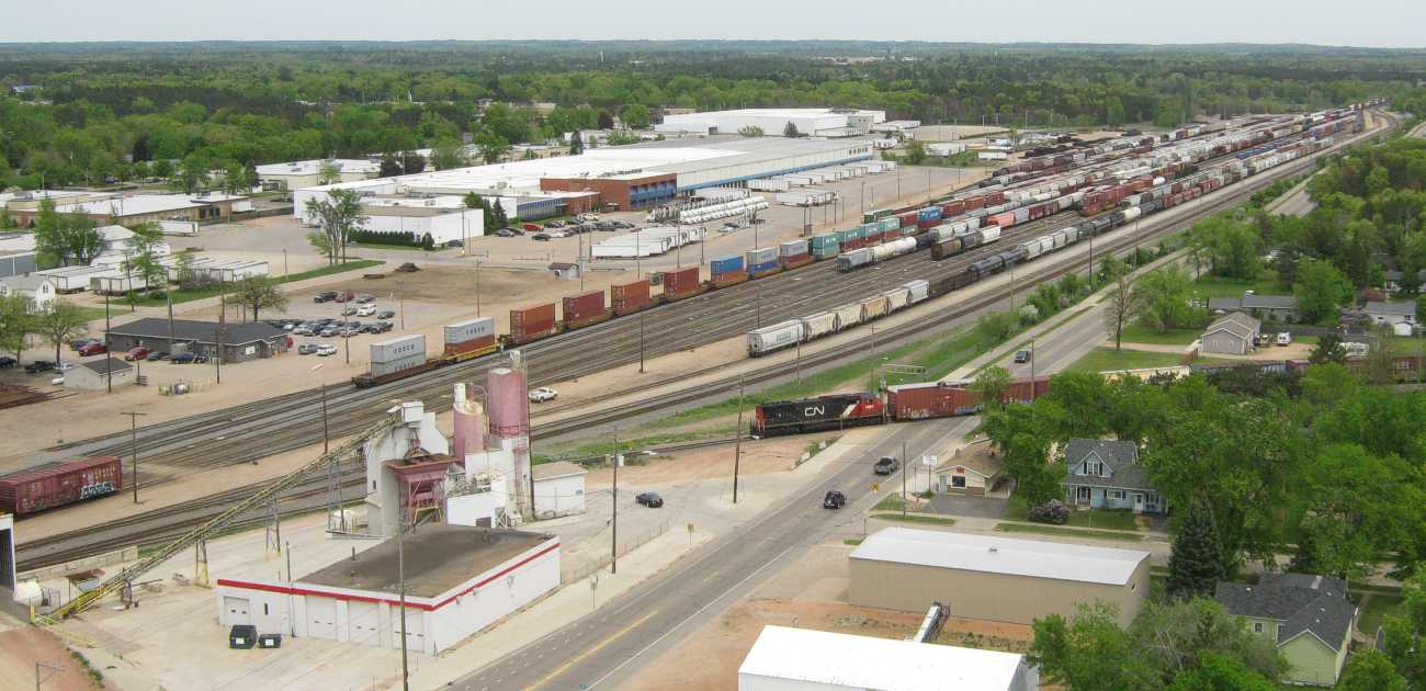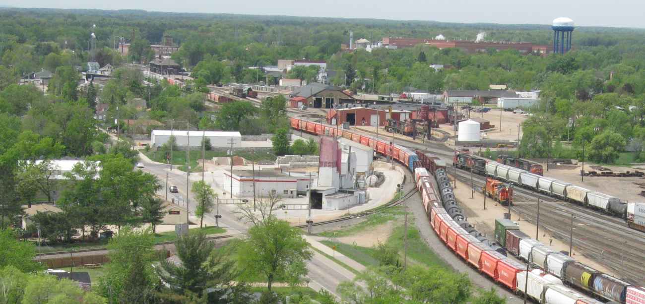 The engine from Plover has arrived with cars for the paper mill west of the Point Depot. |