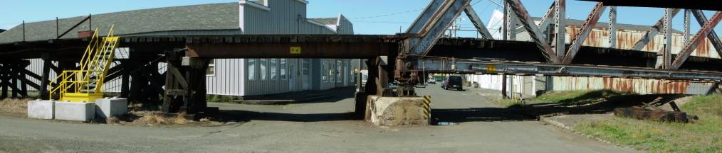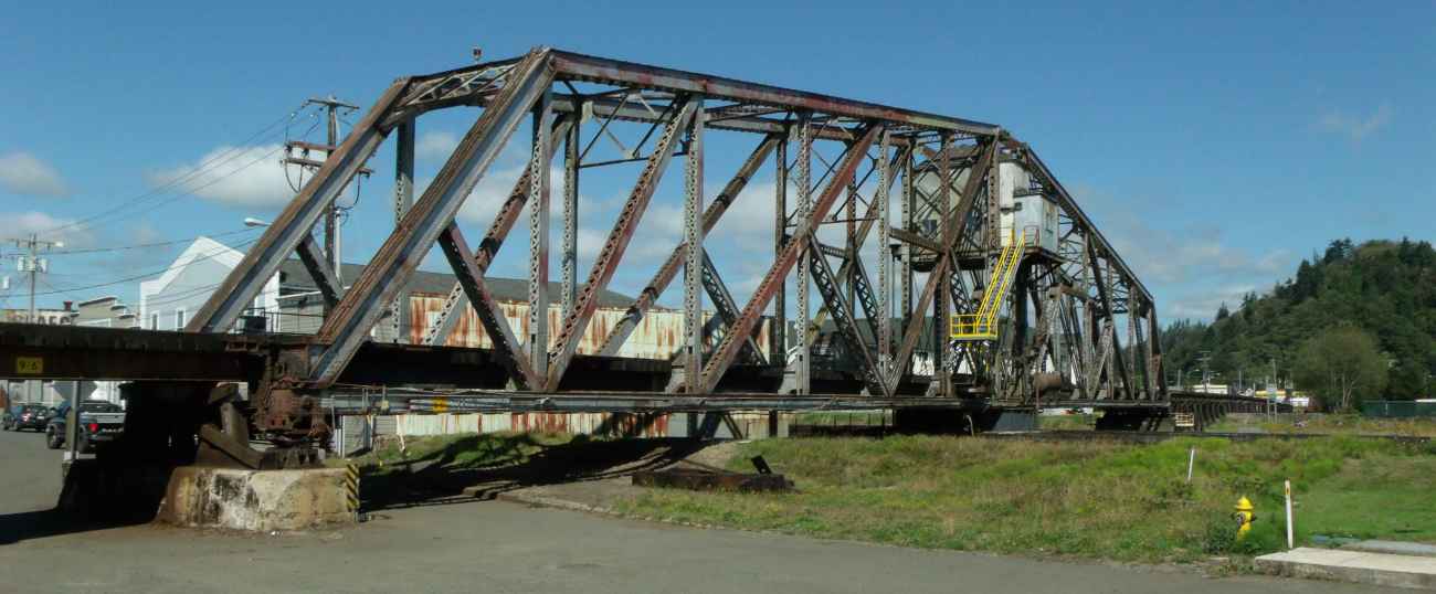 There is a large drawbridge on the PS and P railroad. It is different from many swing bridges because half of it is over land, instead of the more typical bridge with two water channels. |