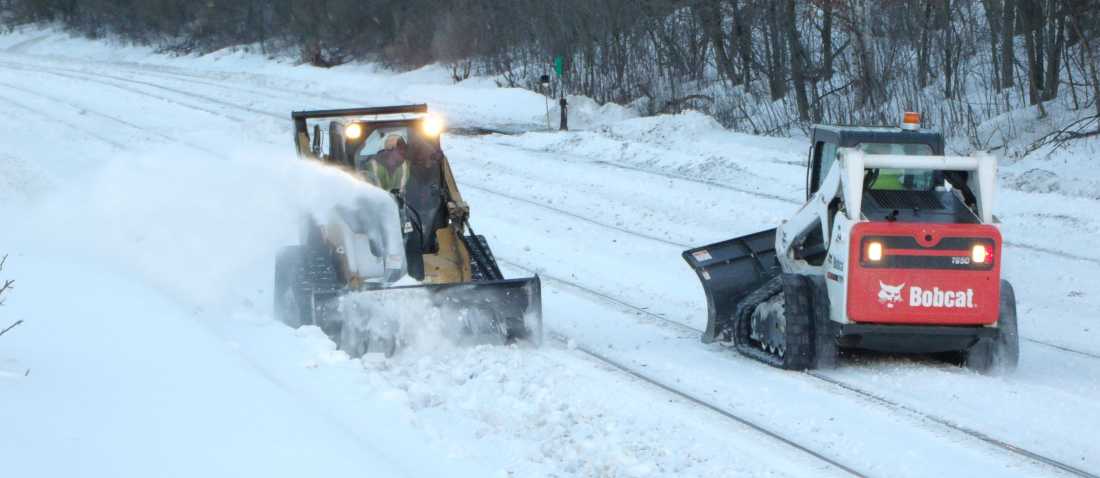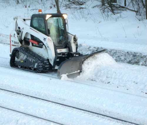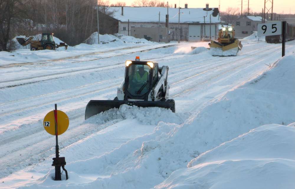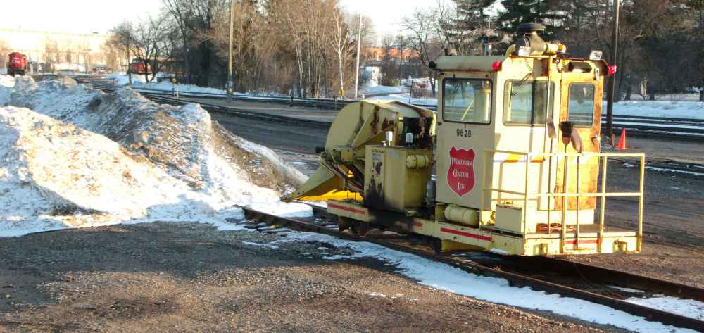 And in a week and after two thawing days, the snow is gone all the way down to the ballast. This switch blower was in use last week, and now its parked in its Summer home. |