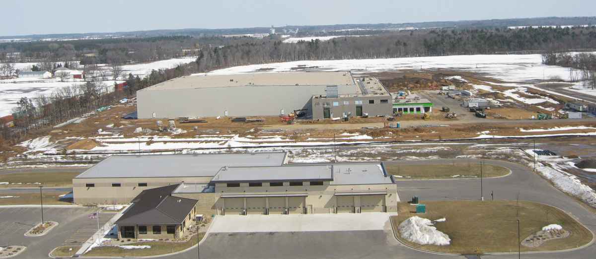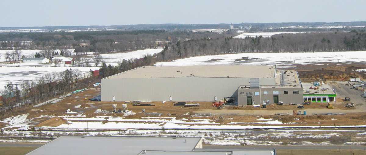 This building is an expansion of Service Trans of Bancroft. Ground breaking was in August 2013, and they kept the construction going through the cold snowy winter. There's plans for a rail siding to bring in refrigerated cars (on the left / north side), but a spur hasn't been built yet.