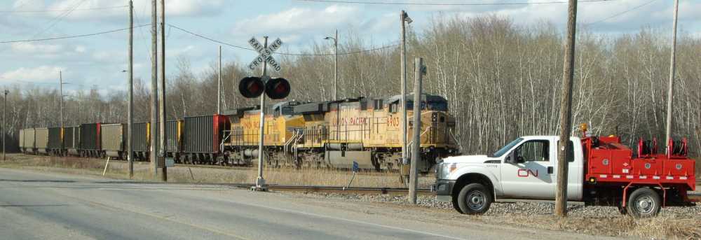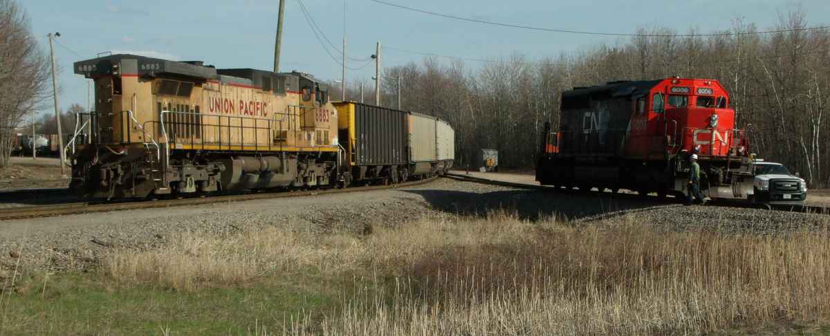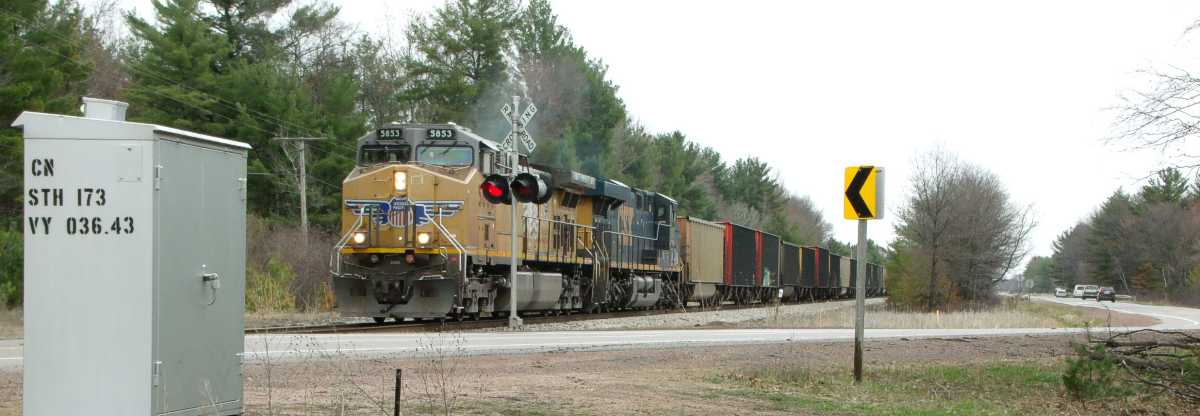 Later in the day I am coming back along highway 173, and now they are moving. The milepost is VY for Valley Sub. This is about 24 track miles east by timetable, or compass southwest, of Wisconsin Rapids. |