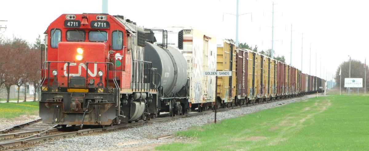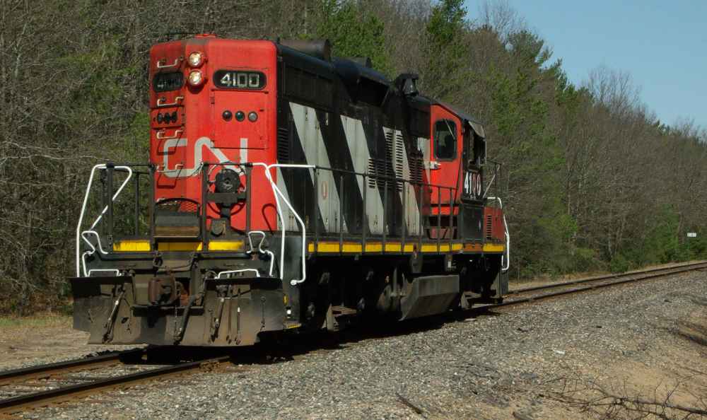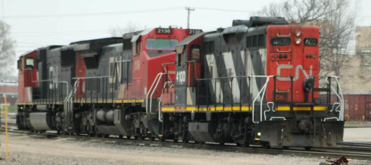 And on a Saturday, the 4100 is traveling long end first at milepost 2 north of Plover. The striped sides might be a little faded, but the red ends still 'glow'.