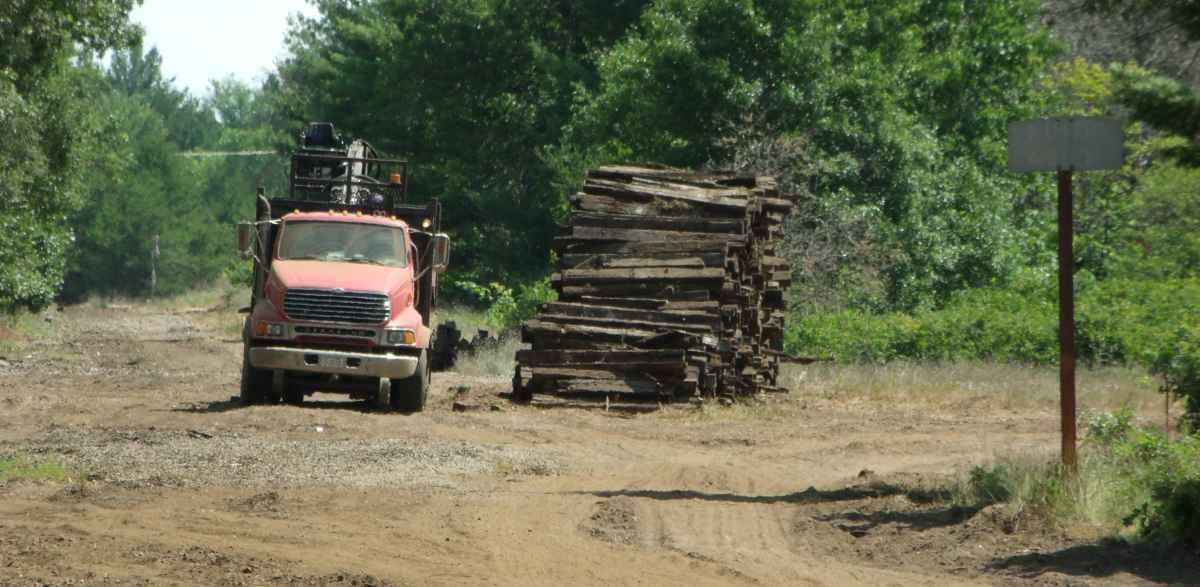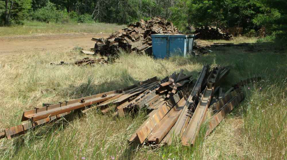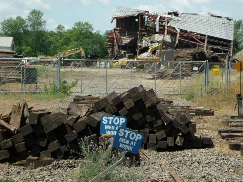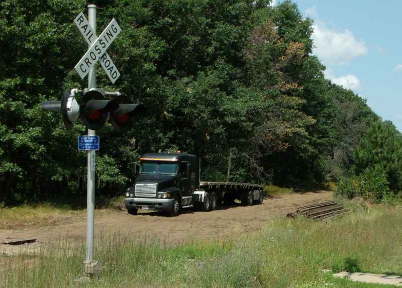 Sherman Street. Getting ready to pick up a pile of 80 lb rail, dated 1924. Last Spring, they installed those blue signs on the crossing signal; something about, In case of emergency, call . . . . . . |
