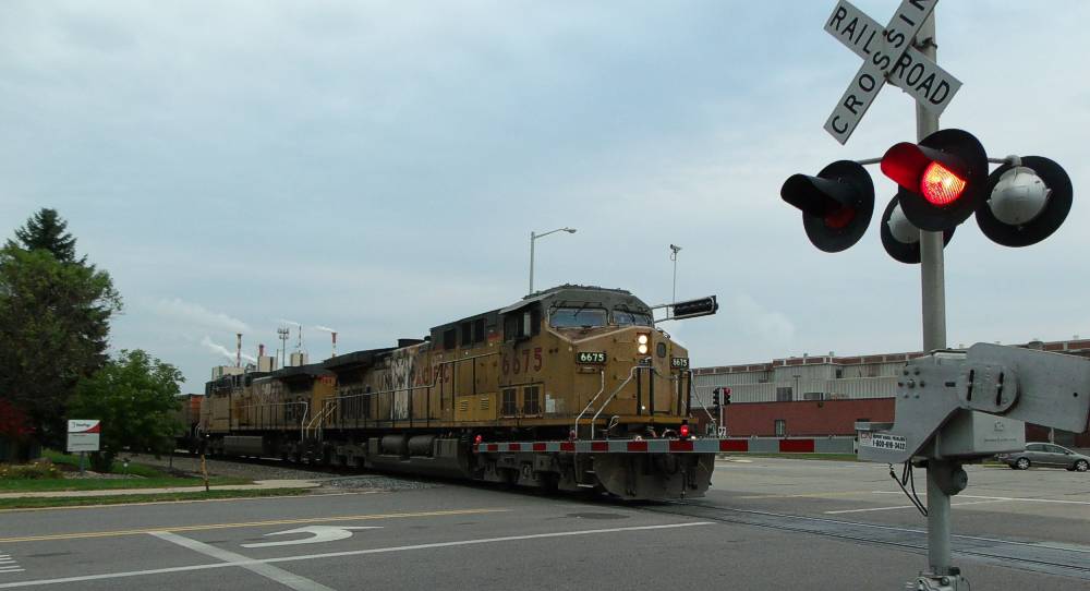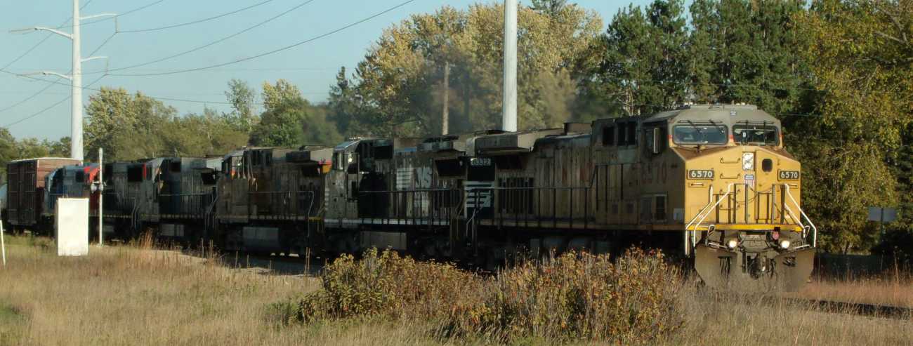 An unusual and unexpected train was moving west of Plover one afternoon. . . . UP up front, NS, UP, two CN, and a GT |