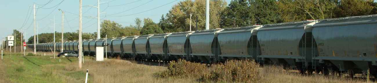 | The train was almost all sand hoppers, westbound. Just four boxcars on the end of hundreds of hoppers. |