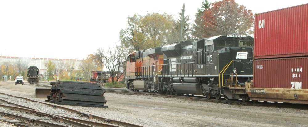 In the late afternoon, the UP / CNW southbound freight arrives in Wisconsin Rapids. They occupy the two tracks on the east side of the Wisconsin Rapids yard (and have trackage rights on the main). This southbound has a BNSF and a black locomotive which I did not recognize at first. Penn Central ??? |