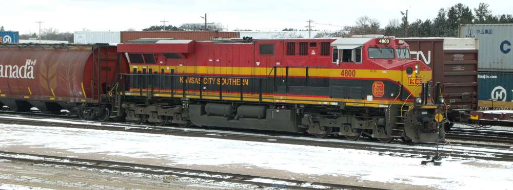 KCS 4800 in Stevens Point, Wisconsin, November 12, 2014. Its two years old, and has 29 sisters somewhere in the US. The weather today is 22 degrees F and windy (we didn't get all the deep snow like Minnesota and the Upper Peninsula) and I didn't hang around to capture it in a more recognizable Stevens Point scene. Thinking about it afterwards, I suspect this is a DPU on the rear of a train? I should have drove by the depot to see what was on the other end. |