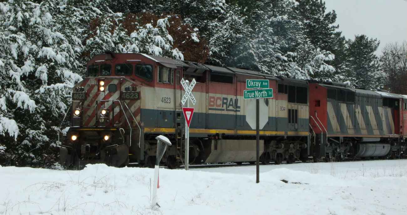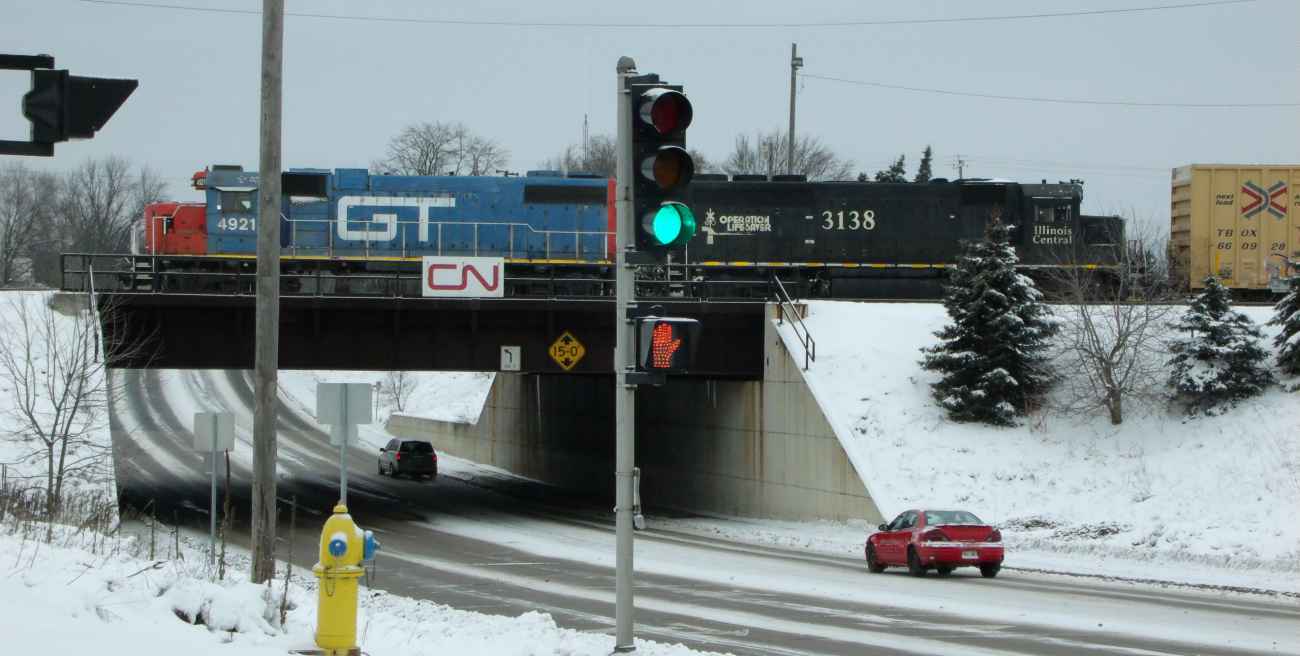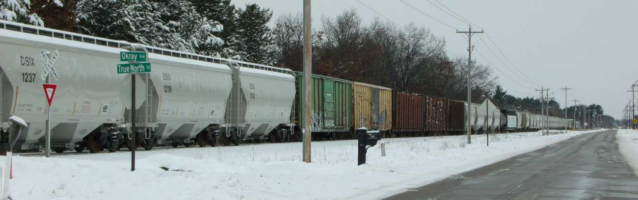 Big trains are running to Rapids via Plover. In the middle of the day, when there's lot of travellers on Business Highway 51 in Whiting; and at 20 mph they can really back up a lot of traffic. |
