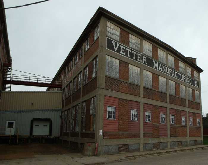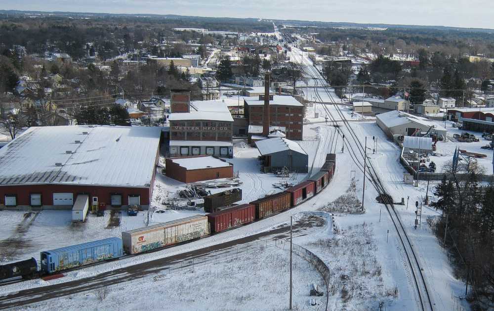 Looking east, the old brick Vetters millwork plant. There used to be spurs on both sides of the brick buildings in the old days, according to an old sketch I saw, but the spurs hardly show on the 1939 Wisconsin historical arials. Maybe they had a lot of grass hiding them. In the old days, weed spray wasn't used as often as now. |
