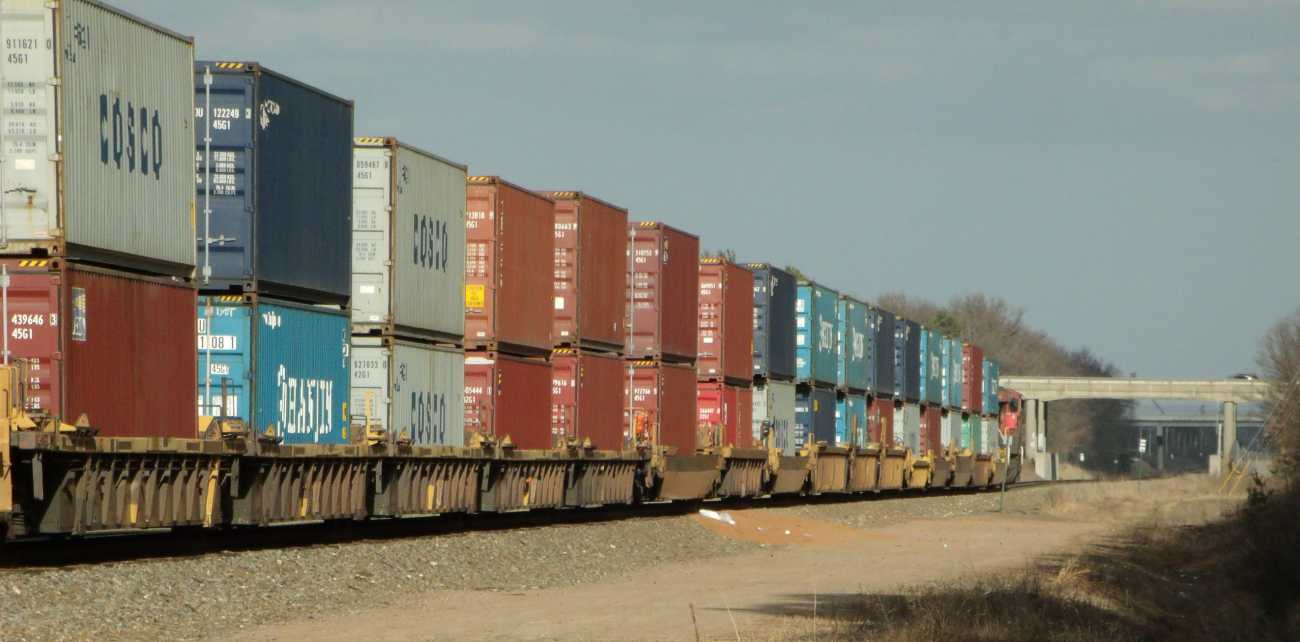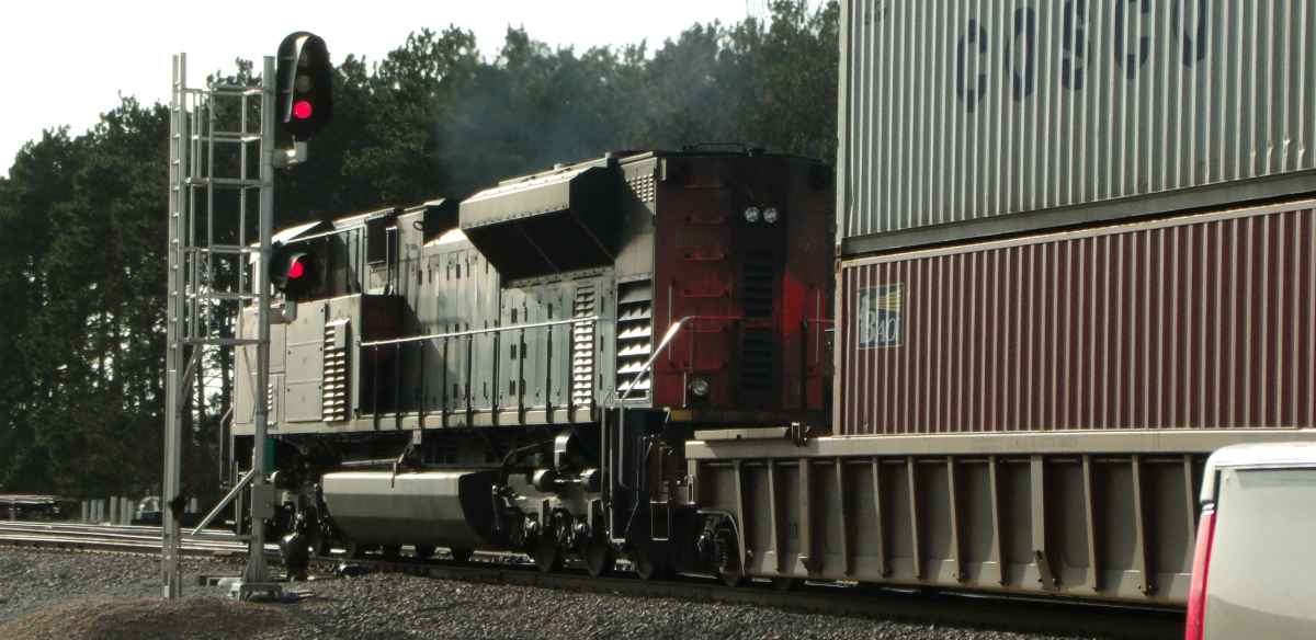 A long container train is eastbound at Hoover Ave. One engine on the front. |
