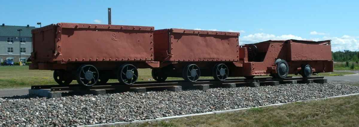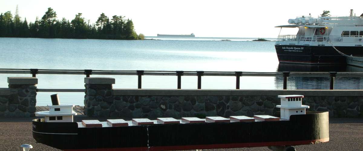 There's a wooden ore boat on shore, and a real one on the Lake in the distance.