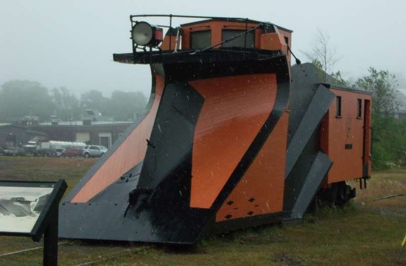 Those white streaks in the picture isn't snow, it's big rain drops. But just wait. Calumet and Hecla display in Calumet. |