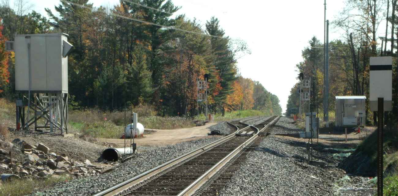 There's crossing gates, track signals, maybe an RFID scanner (is that how they keep track of engines passing?) a car number scanner, and is the hot box detector here, too? And then a heated and air blown power switch. The hill crests just east of here. The east end of the siding is mile 252.8, the west end is 255.2, so that's over 2 miles of siding. |