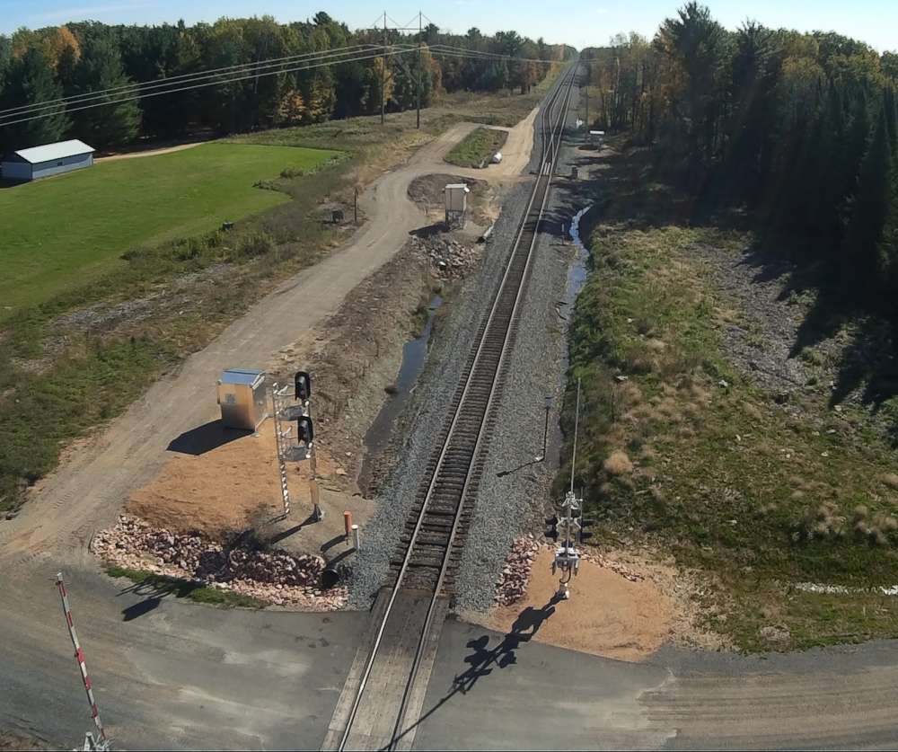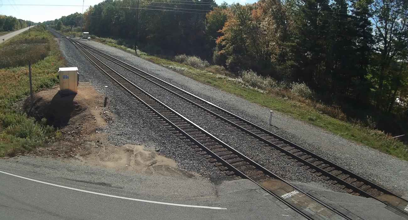 Then I went to Deer Lane, a few miles further west. I hadn't been there in 5 years. I see last year's work to extend the Rocky Run siding, it wasn't this close to the road crossing before. This is Rocky Run North. There's a lot of stuff in the view below (from a quadcopter, or drone, for people that don't differentiate toys from military equipment) Deer Lane is a gravel town road that used to cross the track in the distance, then it was re-routed to this location a quarter mile further west. Years ago, this area had just one track, and the north end of Rocky Run siding was somewhere south of here, out of sight. The Google Maps aerial view this year shows something a year or 2 older, when the siding was extended and the original Deer Lane crossed both tracks. And that would have been a nuisance to cross if a train was parked. Now there's a sweeping curve in the town road to get west of the switch, and the woods has been cleared for the safety vision triangles. Vision is a good idea here, that's a high-speed switch and trains don't slow down. |