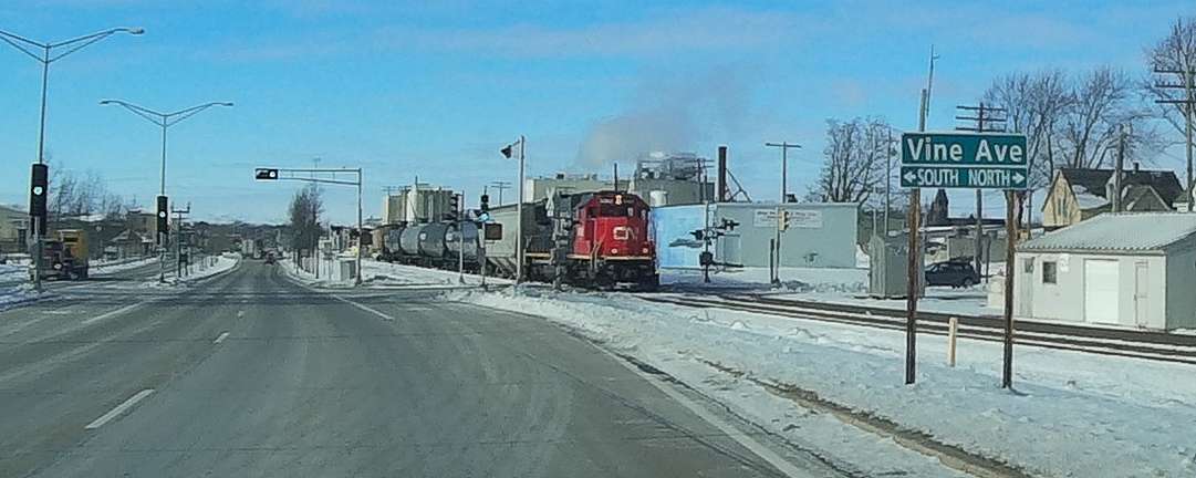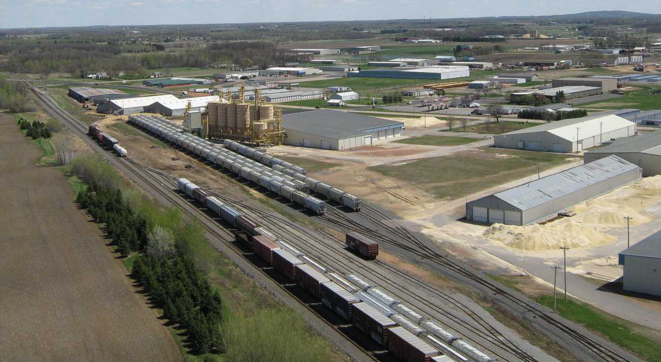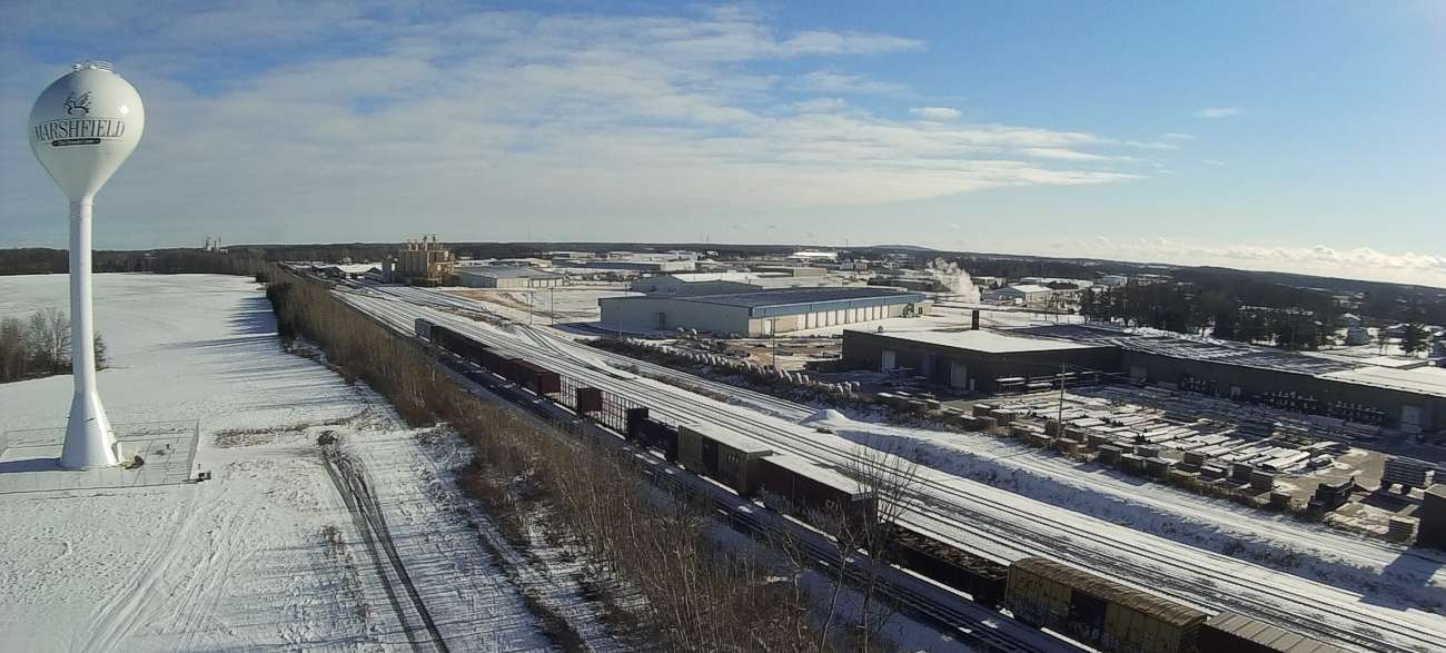 Looking east. The Felkers stainless steel works is across the tracks. A sand plant is in the distance. Squint at the little eastbound Marshfield job in the distance that finished picking up sand hoppers and leaves town. And I don't remember a water tower in this location before, so I would guess that is less than 3 years old. |