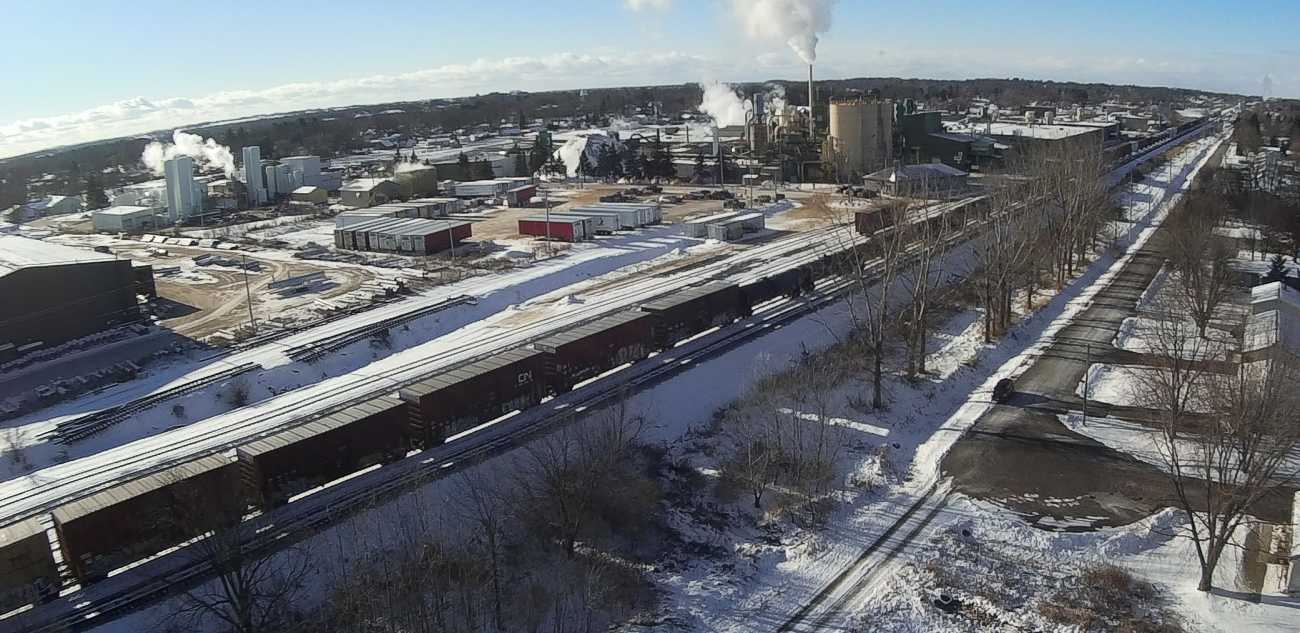I put up the quad copter. Looking west at the Weyerhauser door plant (with the tallest smoke stack), the yard office, and almost out of sight in the distance is the local at Peach Street.