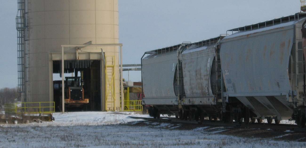 | the Trackmobile and a wheel loader sit in the loading silo bay. |