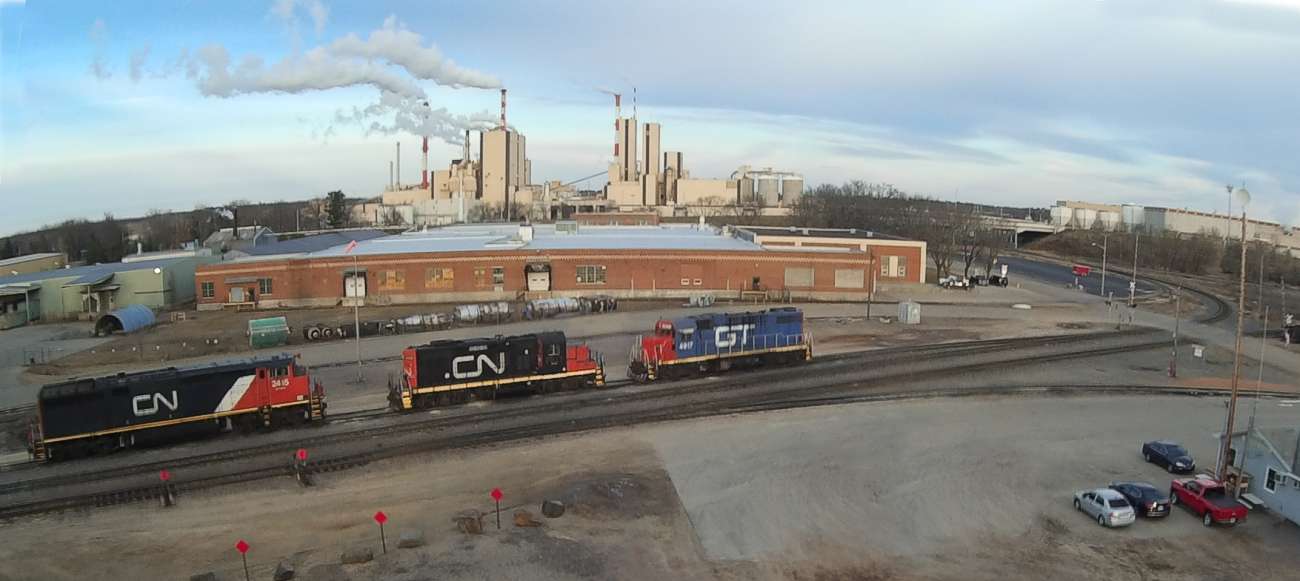 The Dura Beauty Lane yard office collects locomotives between shifts. . . . . (the paper mill fills the horizon.) |