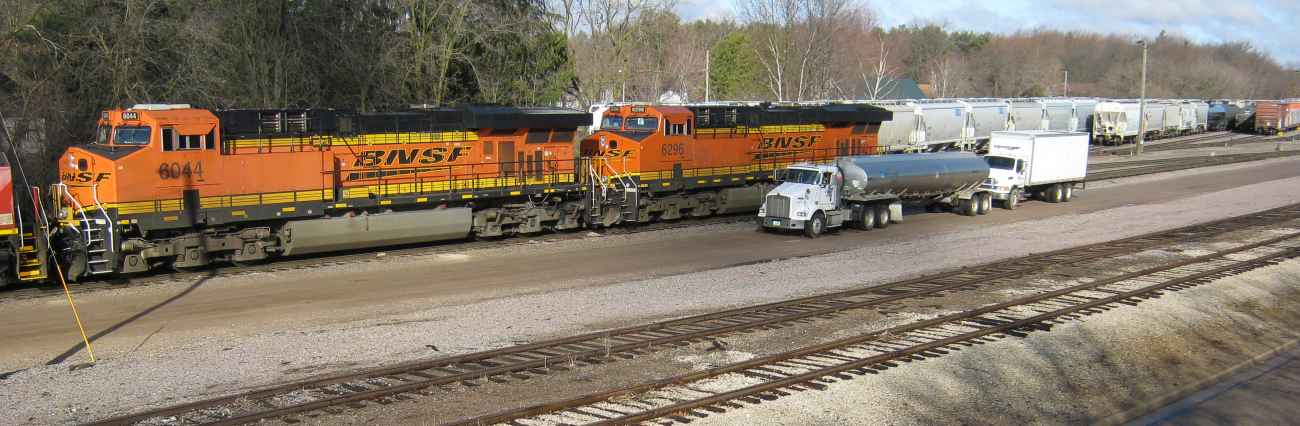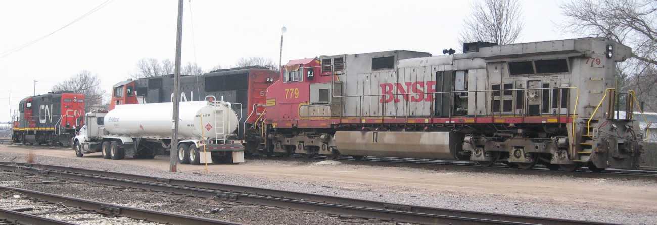 | And on a different morning, a silver BNSF is in line for service and fuel. |