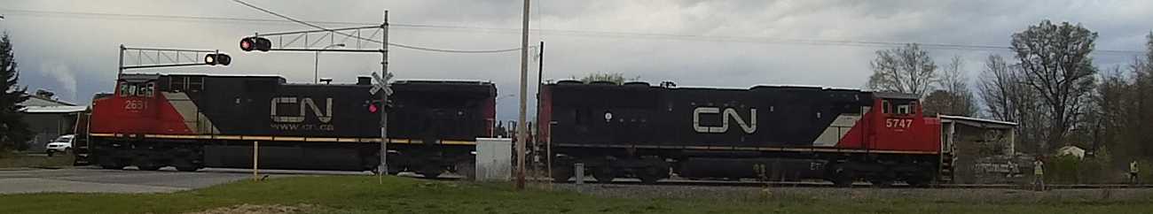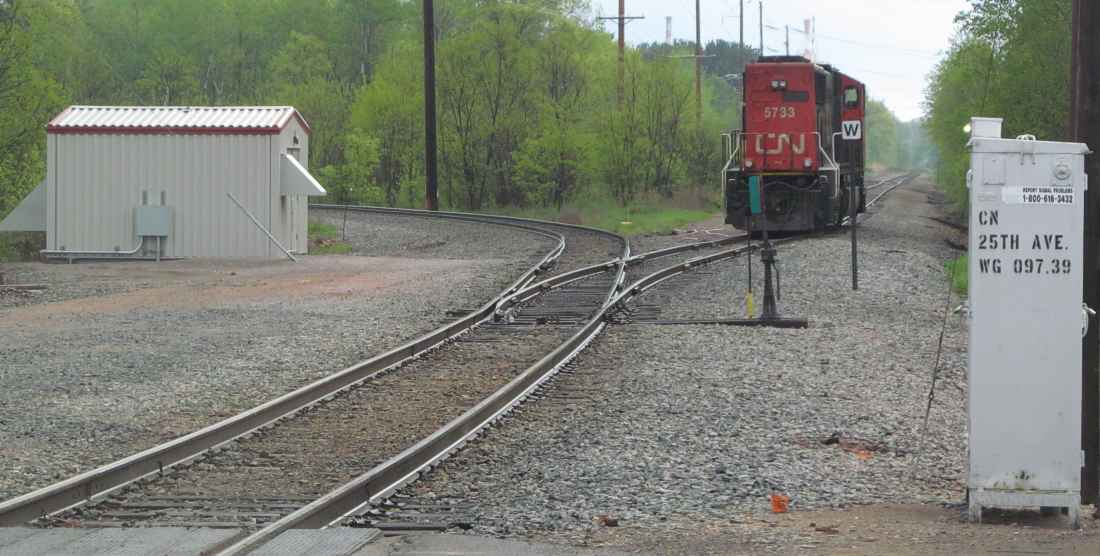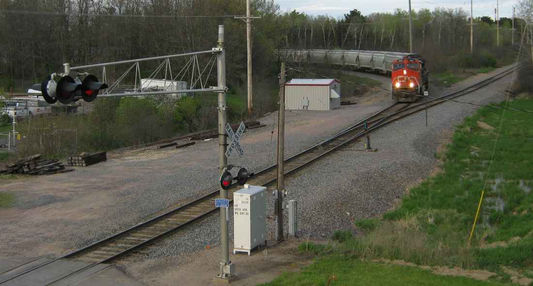 | They cut off from the hoppers and pull across 25th Avenue on the west side of Wisconsin Rapids. |