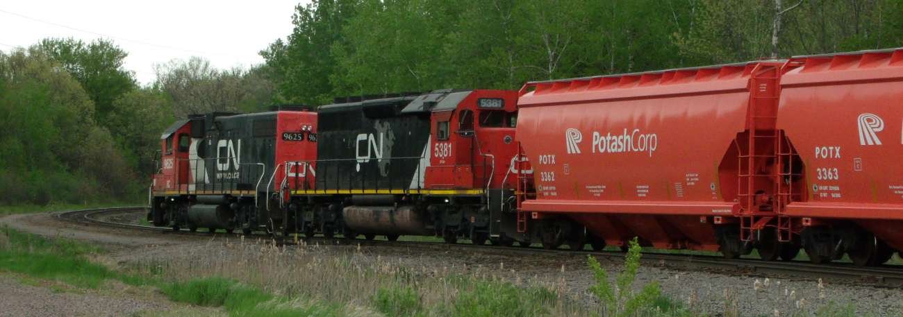 | This is where many 'red - pink' POTX potash hoppers go, and the trackmobile is big enough to move a half dozen of them. |